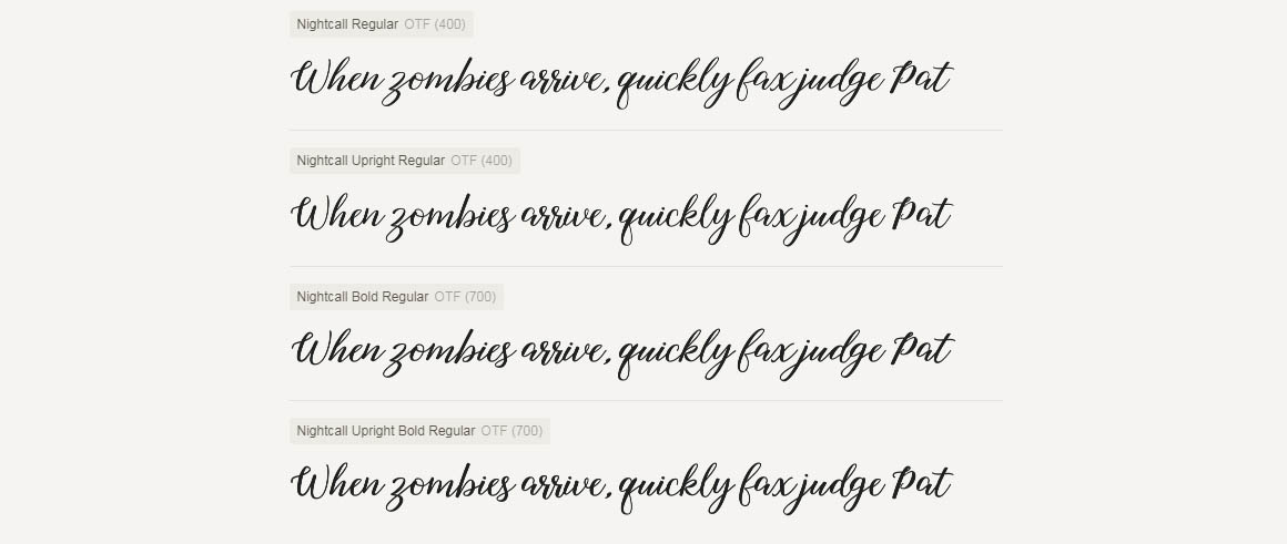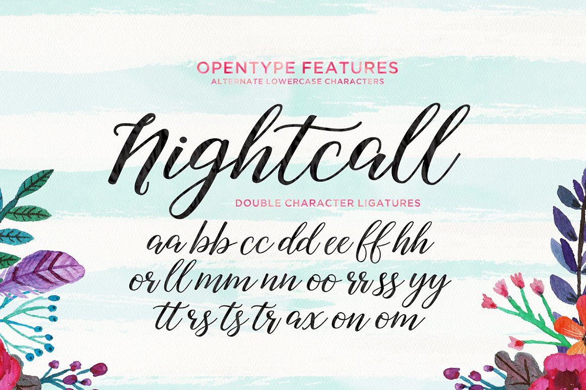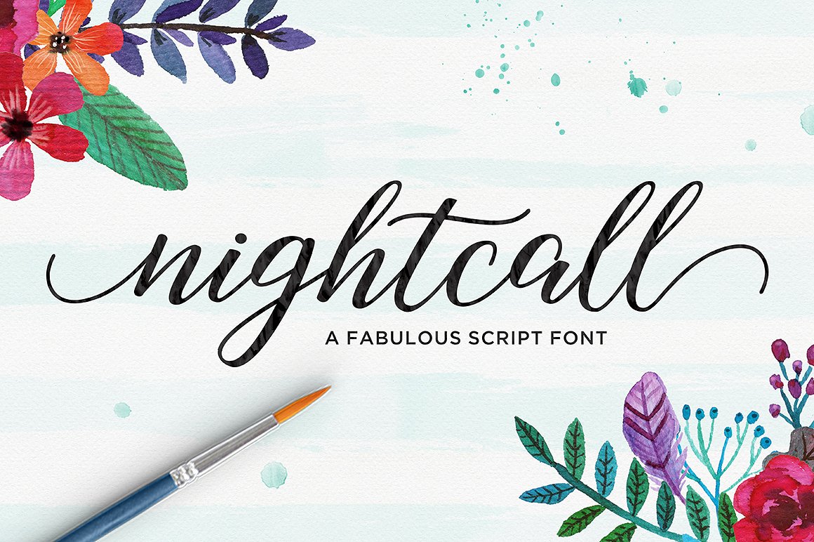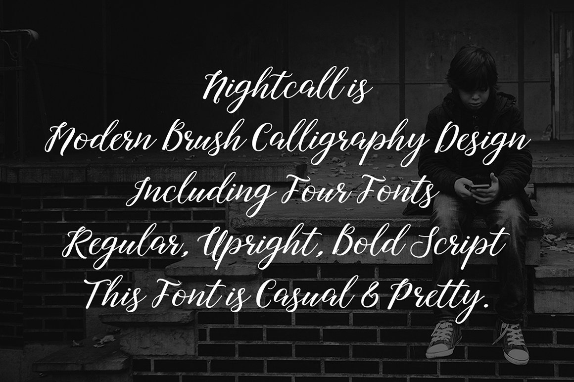 Nightcall Script is modern calligraphy design, including Regular, Upright and Bold Script. This font is casual and pretty with swashes. Can used for various purposes. such as signature, logo, product packaging, wedding invitations, branding, headlines, signage, labels, book covers, posters, quotes and more.