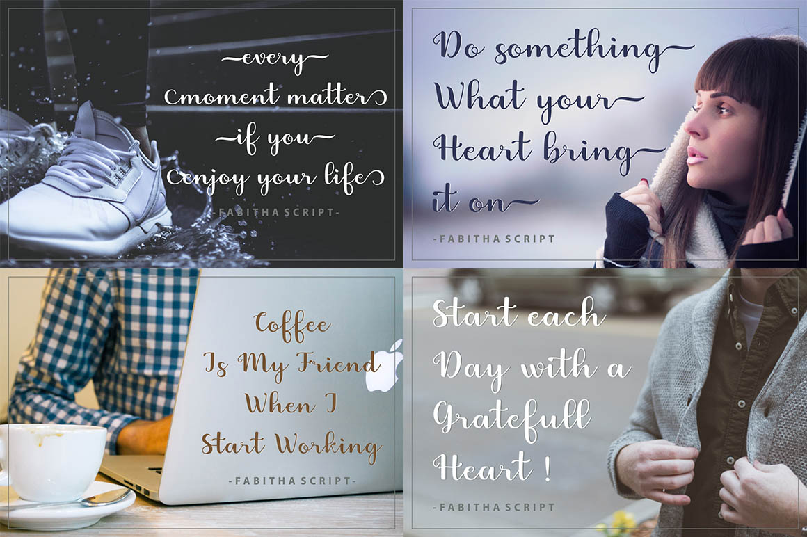 Fabitha Script goes with Modern and Natural Calligraphy, ready to give your design project with Fresh and Fabulous Style. This font have an 177 Standard Glyph + 109 Glyph Alternate in Open Type Standard Format. Suitable for various purpose such as digital lettering, headings, logos, wedding invitation, t-shirt, letterhead, signage, lable, news, posters, badges, branding materials, t-shirt, print, business cards, quotes, logo, poster, and suitable for any graphic design project. Fabitha Script comes as a single font file packed full of great features. It contains a full set of lower & uppercase letters, a large range of punctuation, numerals, and multilingual support. The font also contains several swashes and stylistic alternates for those who have open type capable software (e.g. Photoshop/Illustrator).