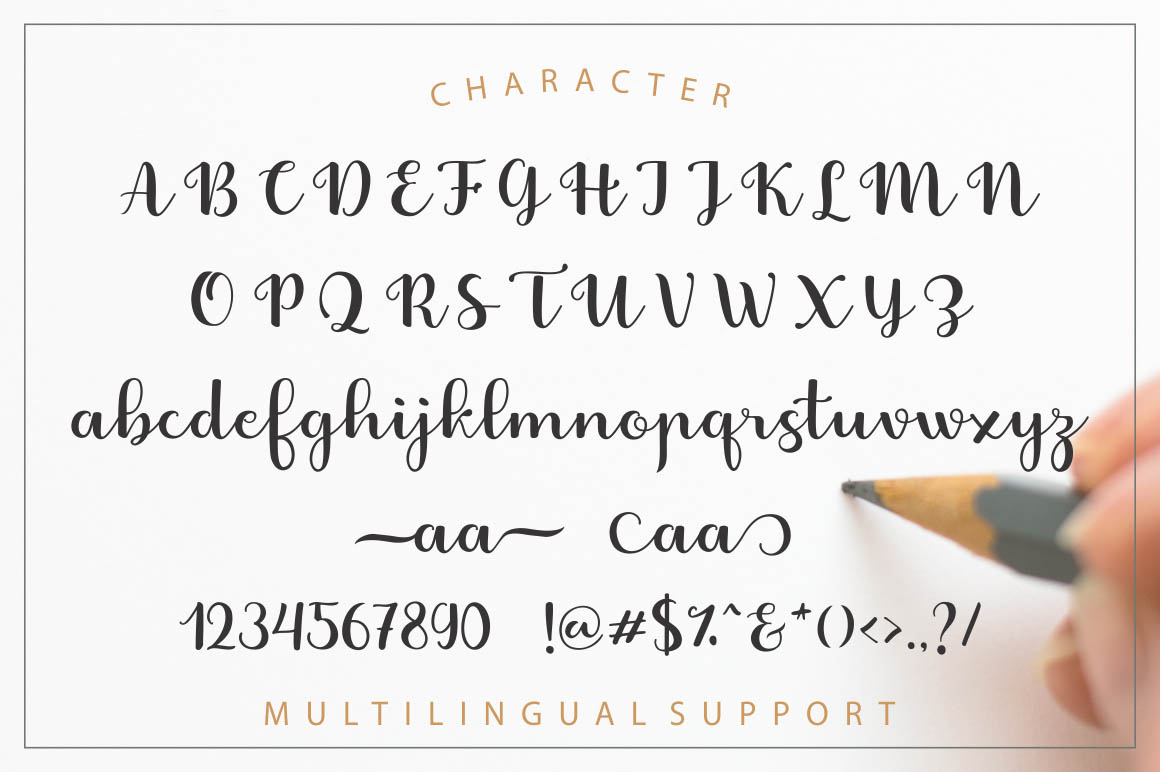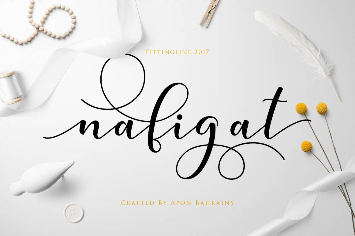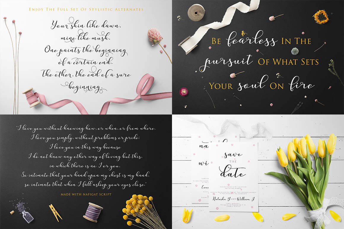 Nafigat Script goes with Romantic and Modern Calligraphy, ready to give your design project with Fresh and Fabulous Style. This font have an 264 Standard Glyph + 408 Glyph Alternate in Open Type Standard Format. Perfect for wedding, branding and romantic invitation and Also Suitable for various purpose such as digital lettering, headings, logos, wedding invitation, t-shirt, letterhead, signage, lable, news, posters, badges, branding materials, t-shirt, print, business cards, quotes, logo, poster, and suitable for any graphic design project. Nafigat Script comes as a single font file packed full of great features. It contains a full set of lower & uppercase letters, a large range of punctuation, numerals, and multilingual support. The font also contains several swashes and stylistic alternates for those who have open type capable software (e.g. Photoshop/Illustrator).