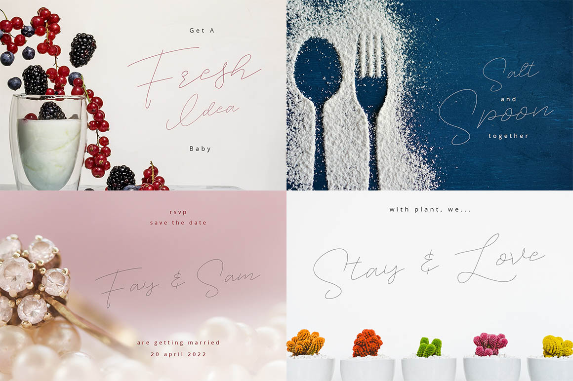 Saythis Script Upright is our latest product that need so much effort to create it. We research and do the best to make this font good for you. This is very suitable for beautiful logo, poster, magazine, photography and any other design project. Saythis Script Upright goes with Romantic and Elegant Upright Calligraphy, ready to give your design project with Fresh and Feminine Style. This font have an 264 Standard Glyph + 503 Glyph Alternate in Open Type Standard Format.