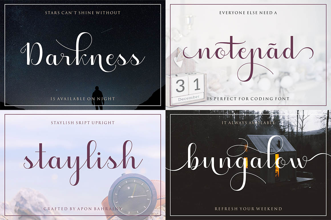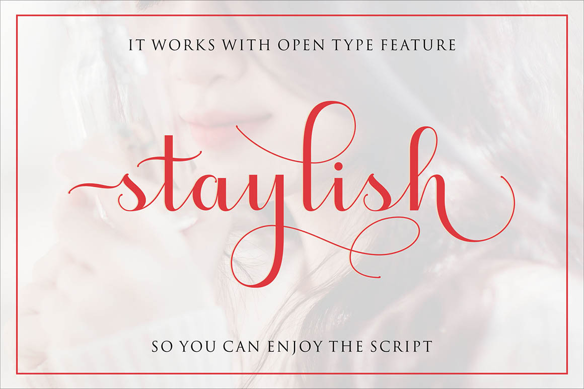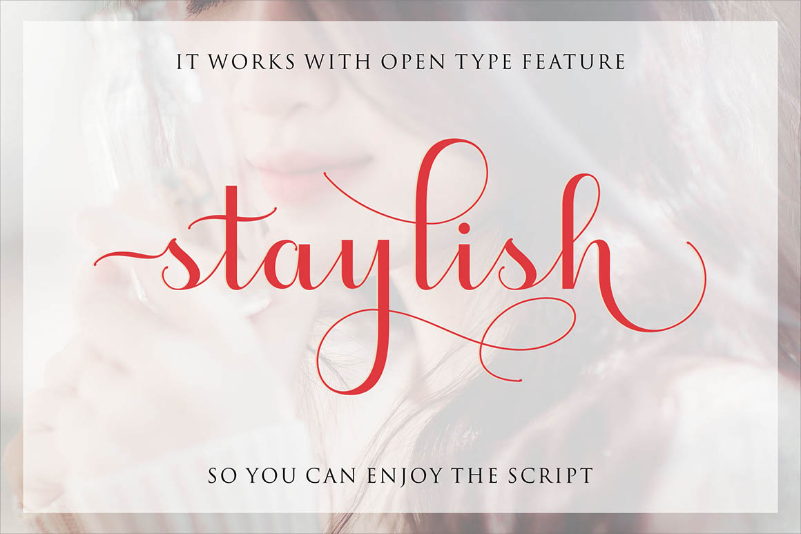 Staylish Script Upright goes with Romantic and Modern Upright Calligraphy, ready to give your design project with Fresh and Fabulous Style. This font have an 264 Standard Glyph + 408 Glyph Alternate in Open Type Standard Format. Perfect for branding and romantic invitation and Also Suitable for various purpose such as digital lettering, headings, logos, wedding invitation, t-shirt, letterhead, signage, lable, news, posters, badges, branding materials, t-shirt, print, business cards, quotes, logo, poster, and suitable for any graphic design project. Staylish Script Upright comes as a single font file packed full of great features. It contains a full set of lower & uppercase letters, a large range of punctuation, numerals, and multilingual support. The font also contains several swashes and stylistic alternates for those who have open type capable software (e.g. Photoshop/Illustrator).