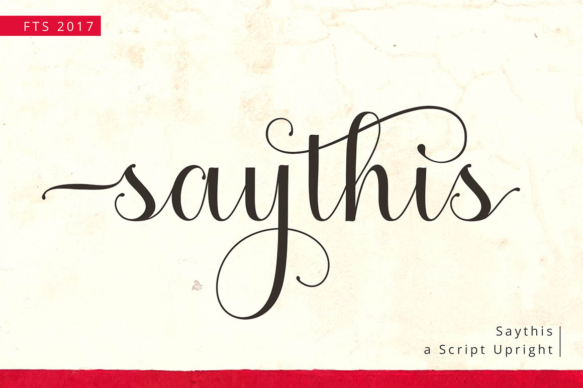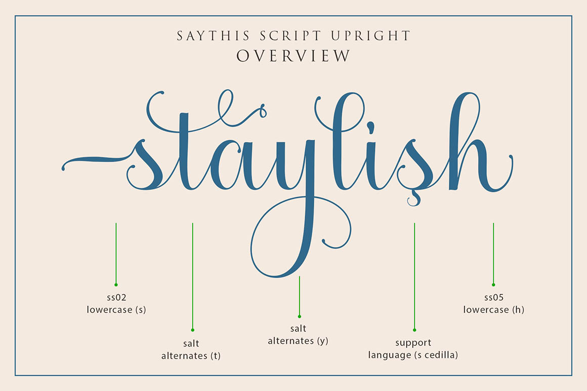 - Saythis Script Upright (.ttf and .otf) have 767 glyphs, comes with Upper and Lowercase Standard Characters, Punctuation, Numerals. And other Glyphs variation of the OpenType features such as Standard Ligature, Titling Alternates, Stylistic Alternate and 8 Stylistic Set (ss01 – ss08). You can see the samples here : http://bit.ly/2eMxz6k