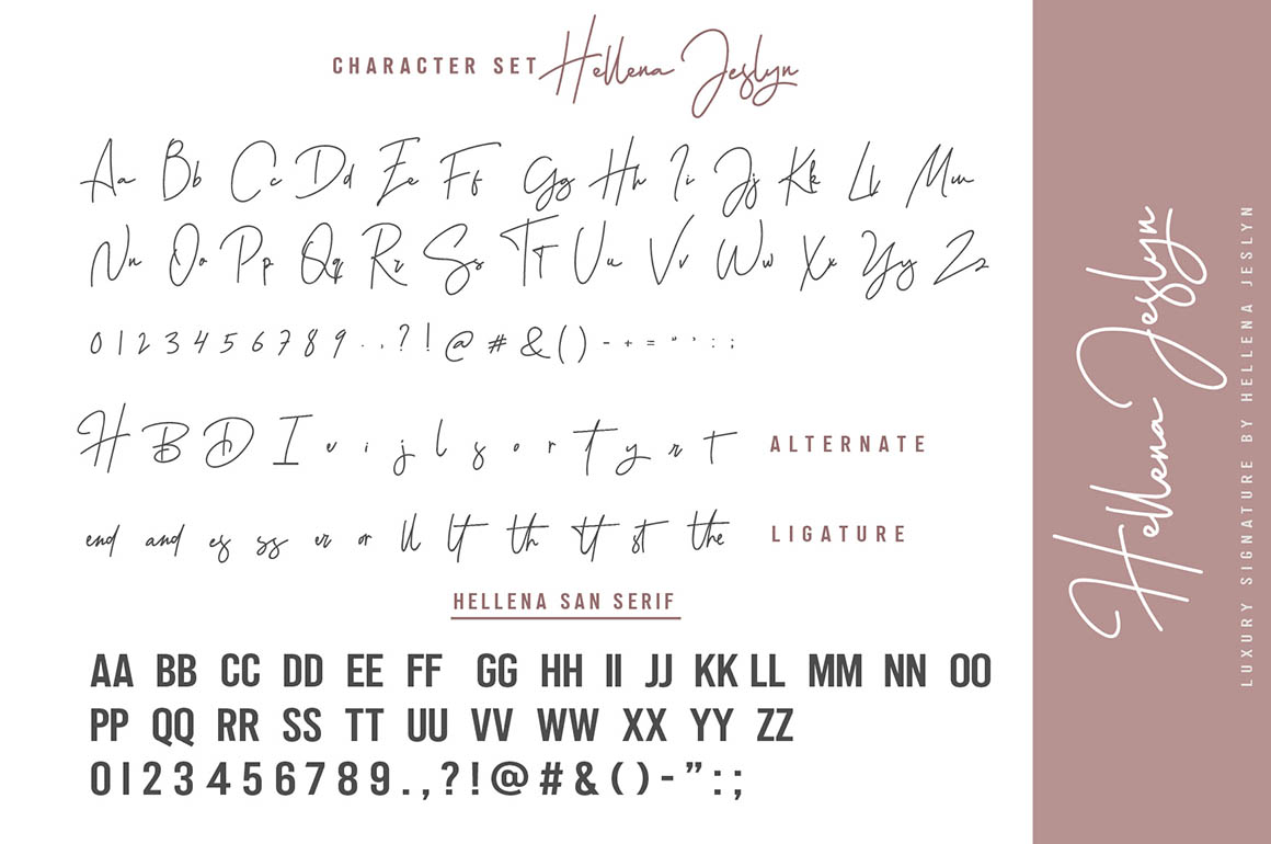 Hellena Jeslyn two of our newest fonts with monoline and sans Serif. This script is also equipped with Ligatures and Stylistic Alternates which will make the font signatures more real. Hellena Jeslyn is the best choice font for: Wedding Invitations, quotes, Posters, Logos, Print Ads, Digital Ads, Promotional Products etc.