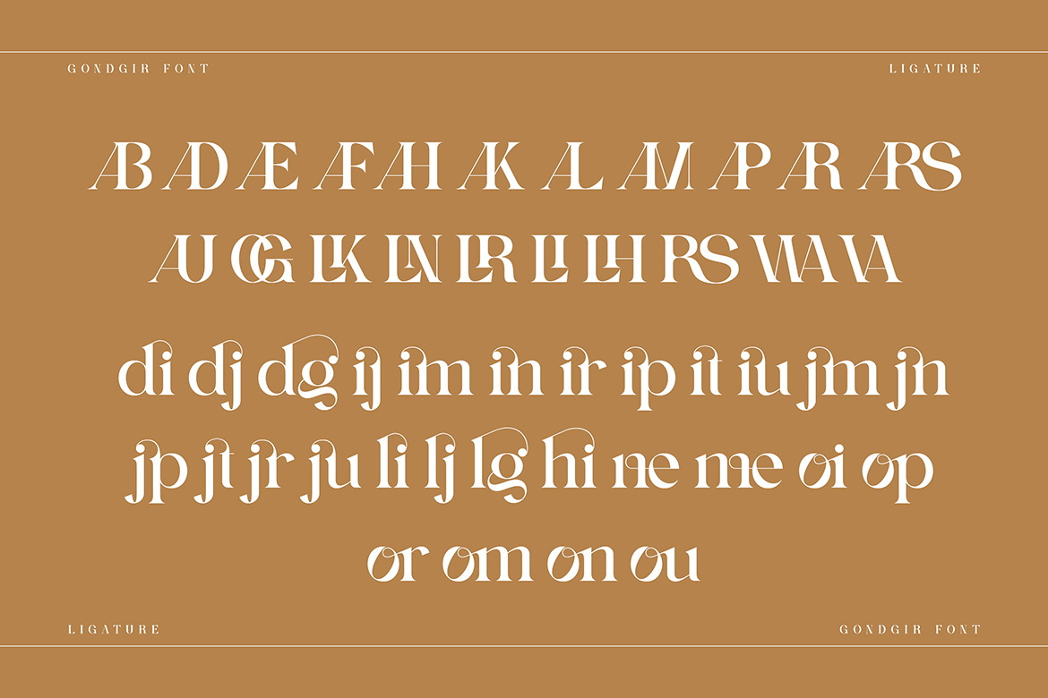 Trendy, classy & modern style serif font for your fancy projects. Bold, elegant, fashion and classic style on Gondgir font will be great for any branding project. Lot of alternates and ligatures will help you to create unique and original logo design or website header! Enjoy 🙂