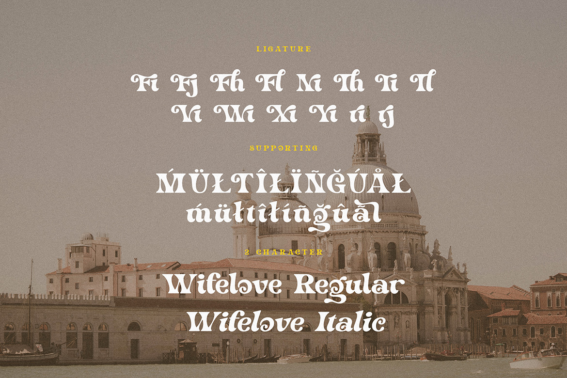 Trendy, groovy, crazy & retro style serif font for your fancy projects. Elegant, artistic and funky style on Wifelove font will be great for any branding project. Lot of alternates and ligatures will help you to create unique and original logo design or website header! Enjoy 🙂