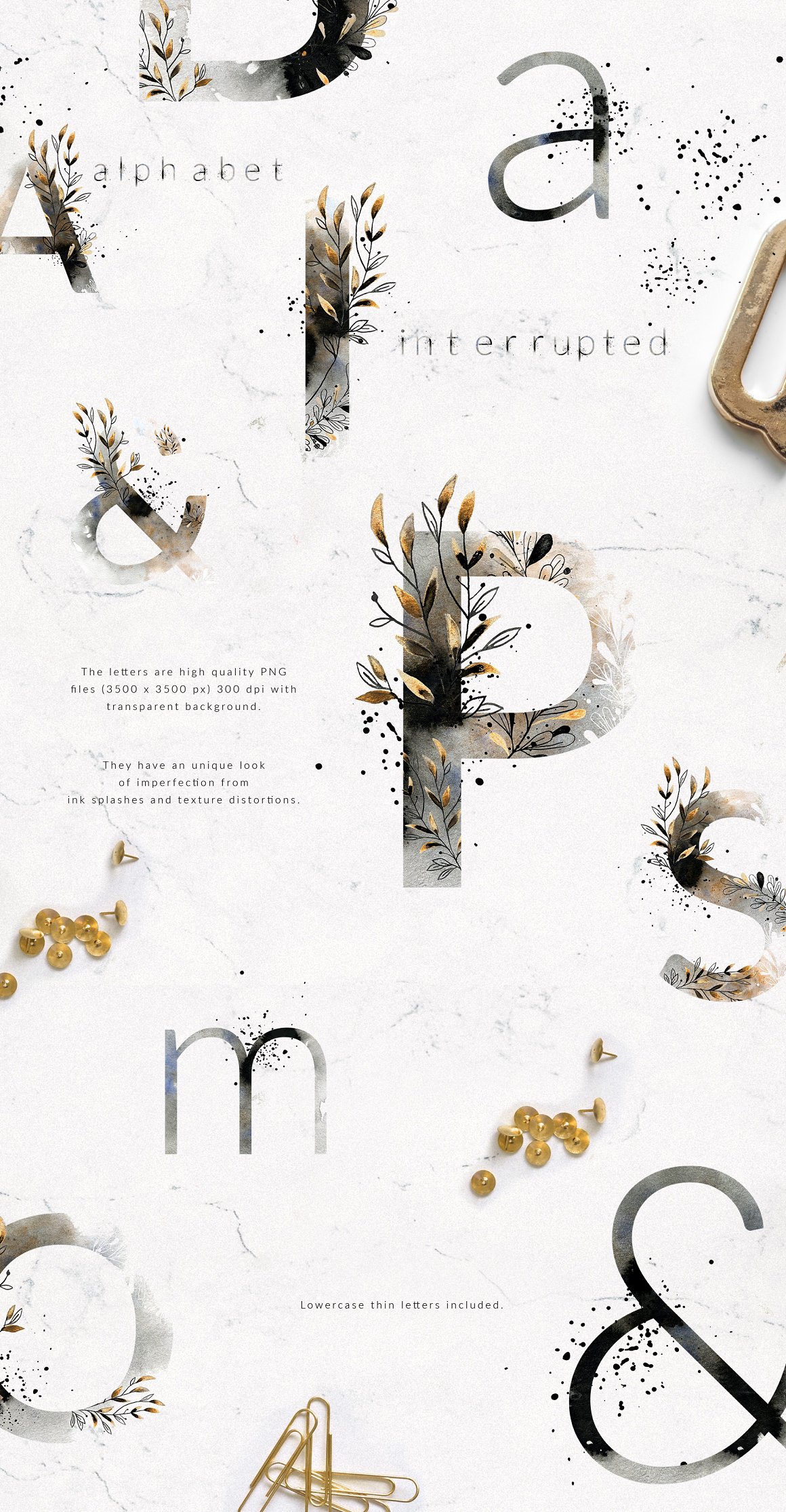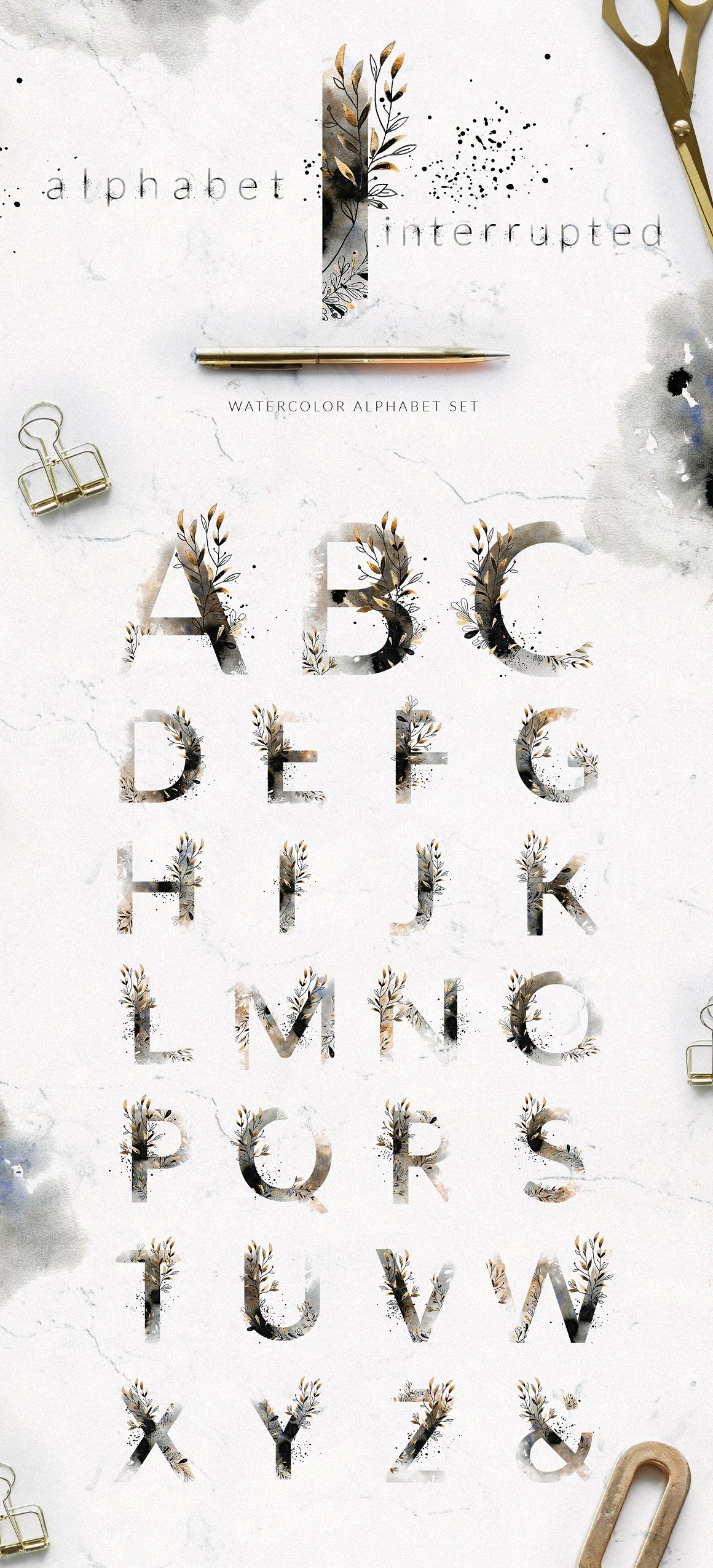 I am very happy to introduce to you the Alphabet Interrupted Watercolor Set. It has been created from hand painted watercolor and ink illustrations and backgrounds. It has a unique touch of imperfection. You will find here both uppercase and lowercase letters and also some graphics.