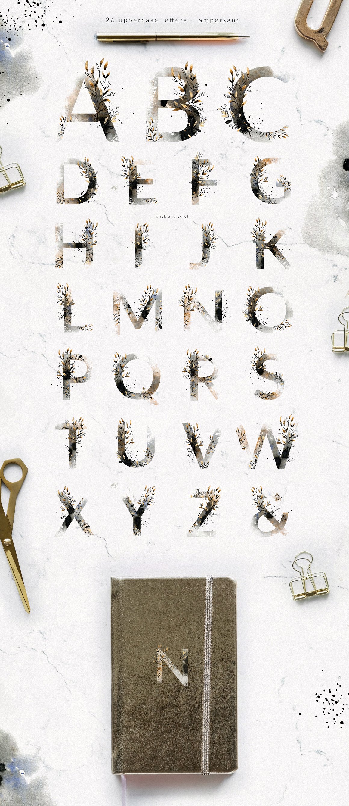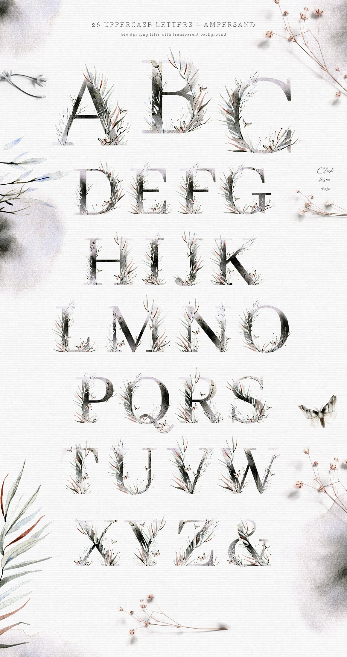 27 x .PNG – 26 uppercase letters + ampersand with transparent texture (for brighter backgrounds) 300 dpi with transparent background 3500 x 3500 px