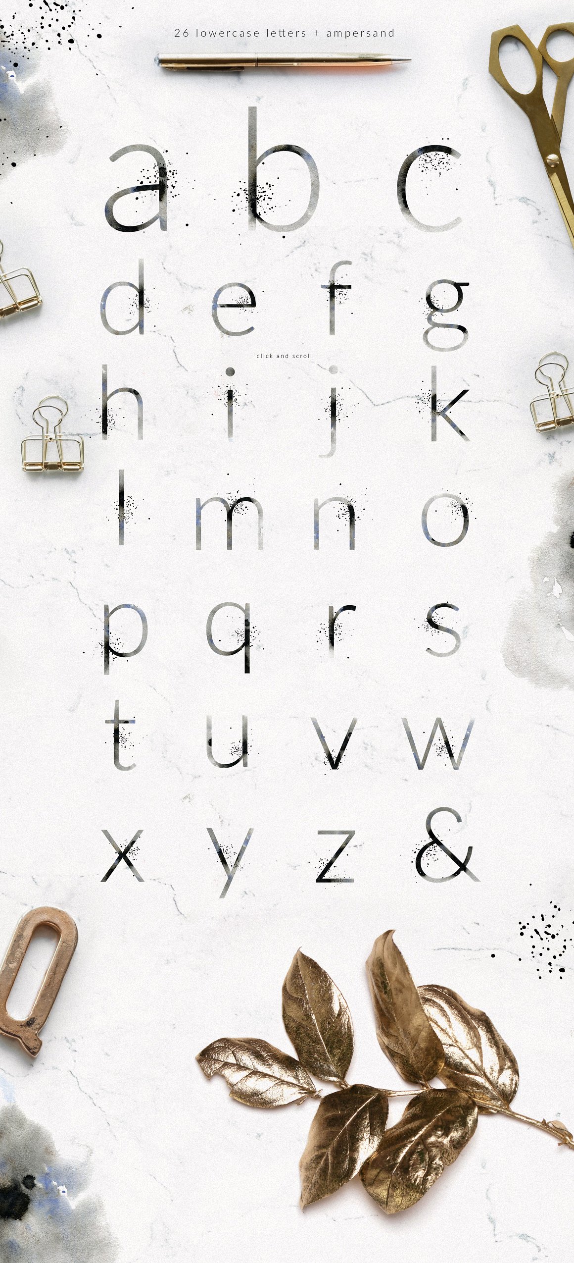 27 x .PNG – 26 lowercase letters + ampersand with transparent texture (for brighter backgrounds) 300 dpi with transparent background 2400 x 2900 px
