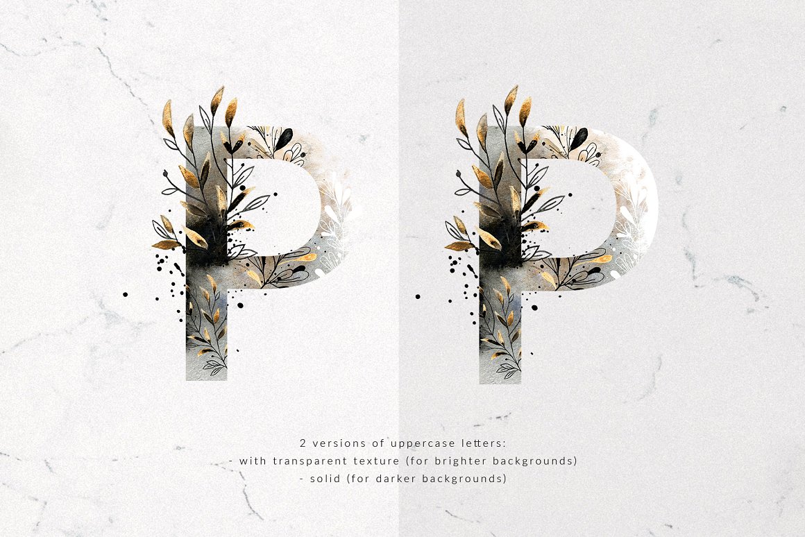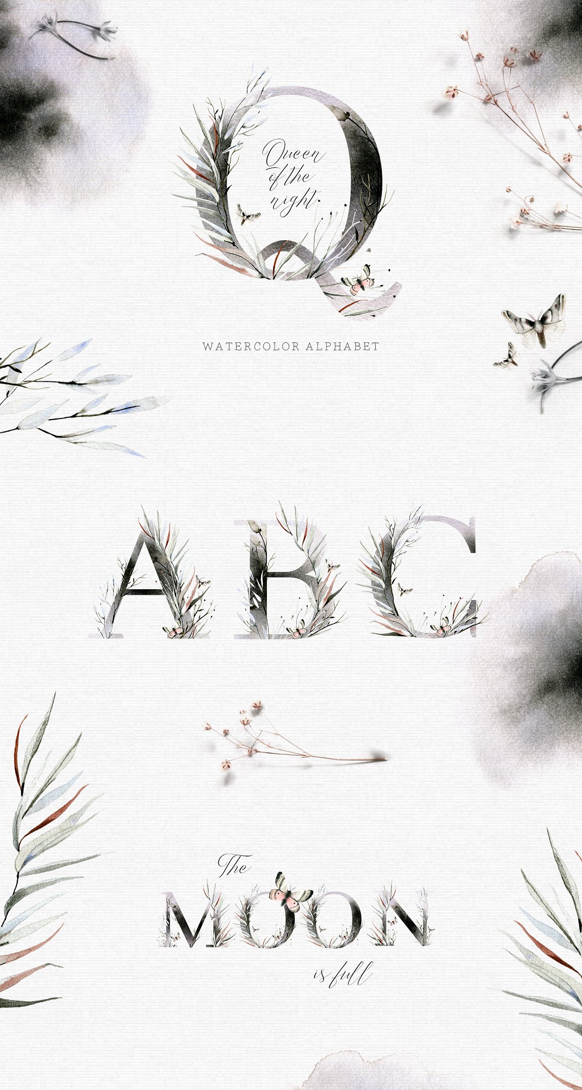 I am very happy to introduce to you the Queen of the NIght Watercolor Alphabet Set. It has been created from hand painted watercolor and ink illustrations. It contains uppercase alphabet letters and numbers.
