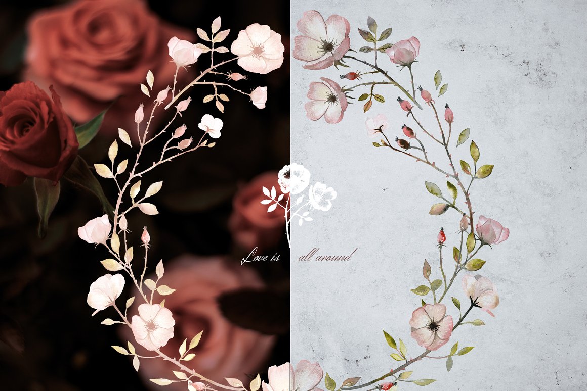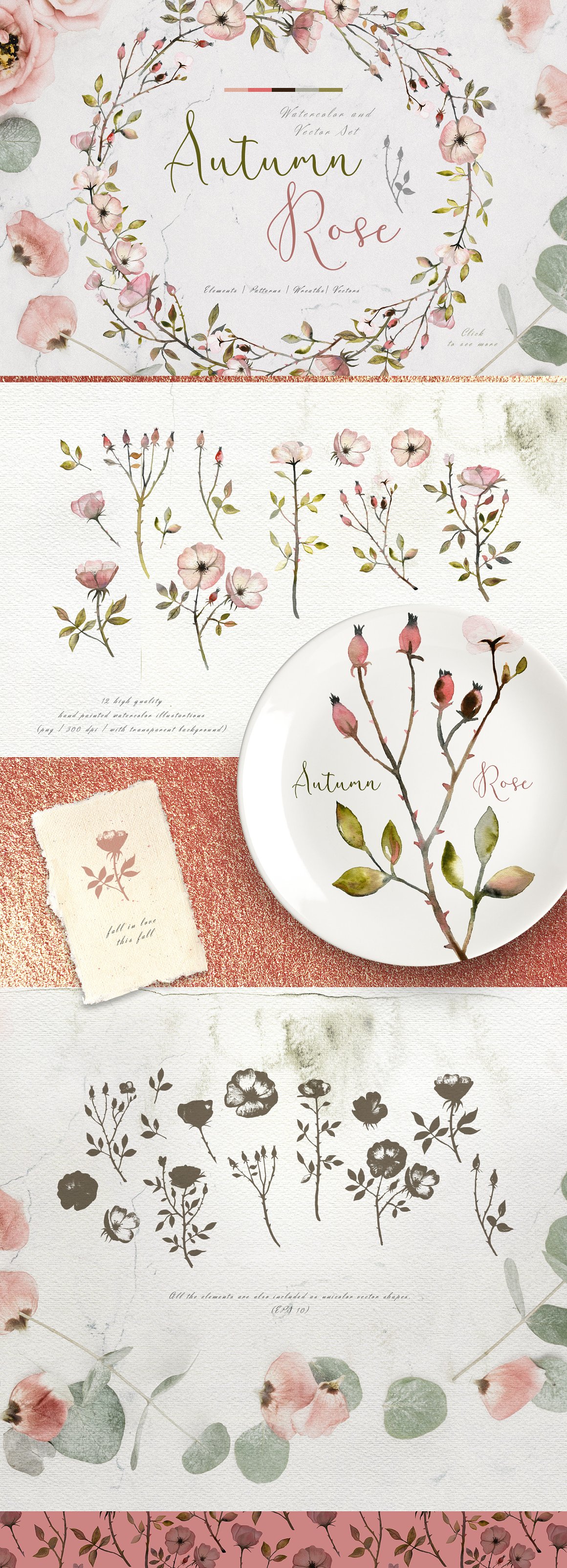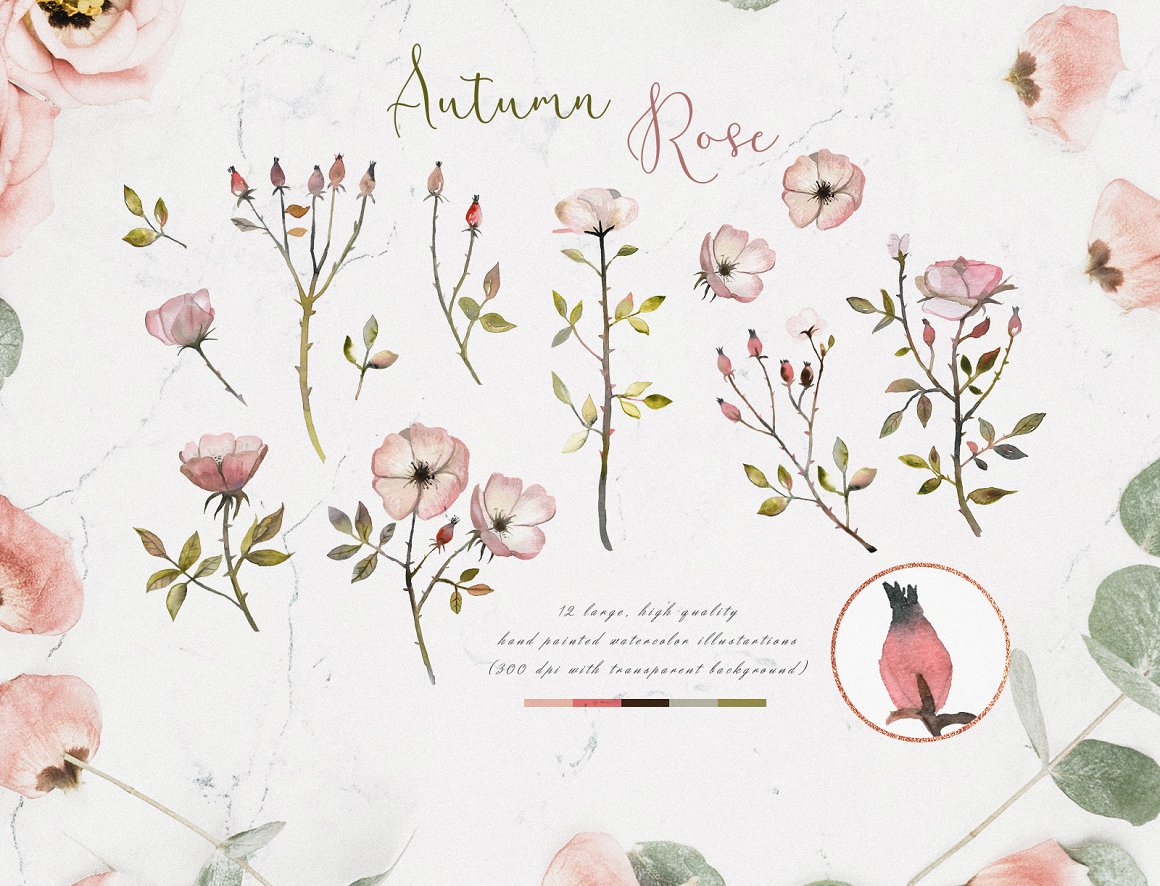 I am very happy to introduce to you the Autumn Rose Watercolor Set. It has been hand painted with watercolor. There are 12 watercolour elements and 14 flat vector shapes. You will also find premade and ready to use compositions (wreaths), background and patterns. This set is perfect for weddings, cards, packaging, blogs and as home decoration elements.