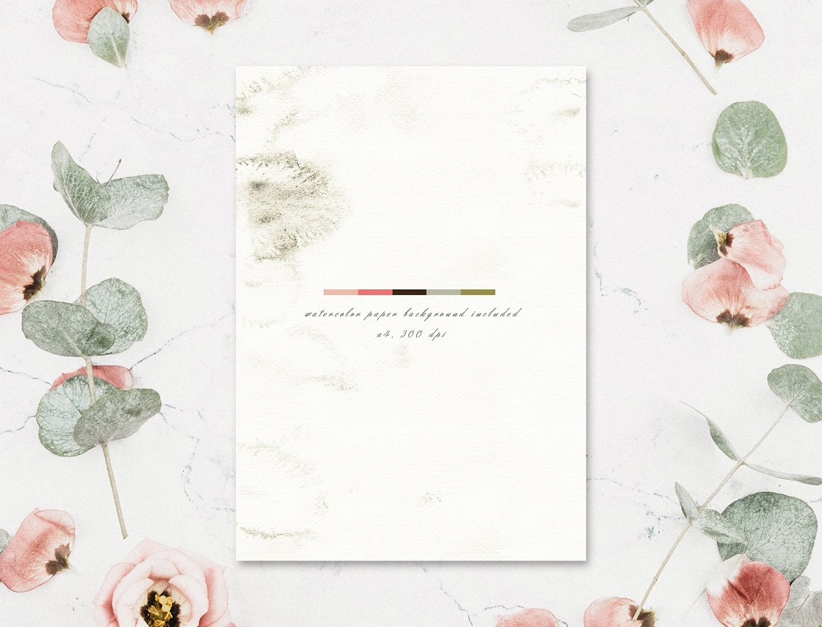 1 x BONUS watercolor paper texture 4500 px wide (300 dpi, .jpg) You can see the paper in the background in the screen files.