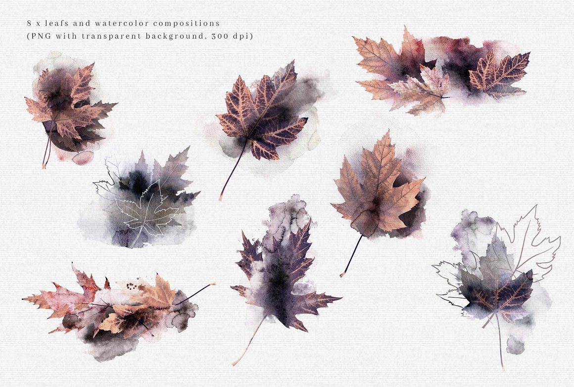 8 x .PNG watercolor and leafs COMPOSITIONS (300 dpi with transparent background):