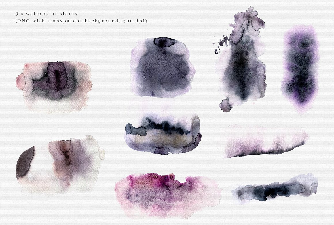 9 x .PNG watercolor STAINS (300 dpi with transparent background)