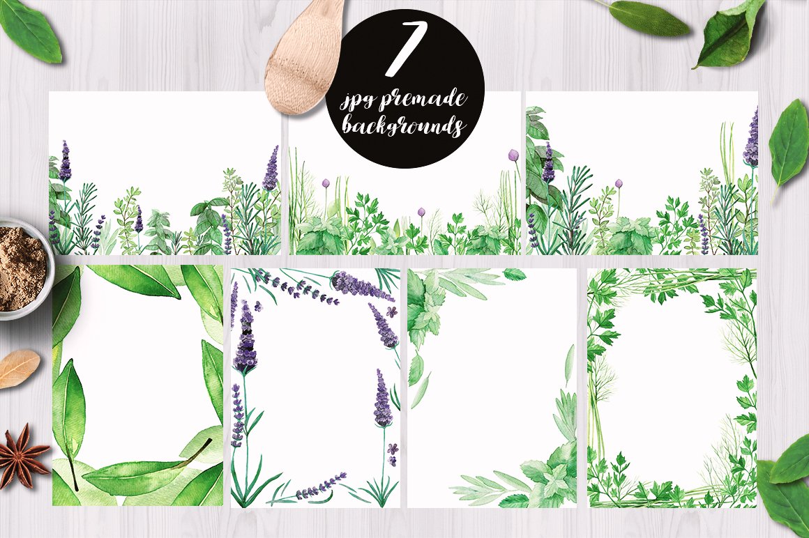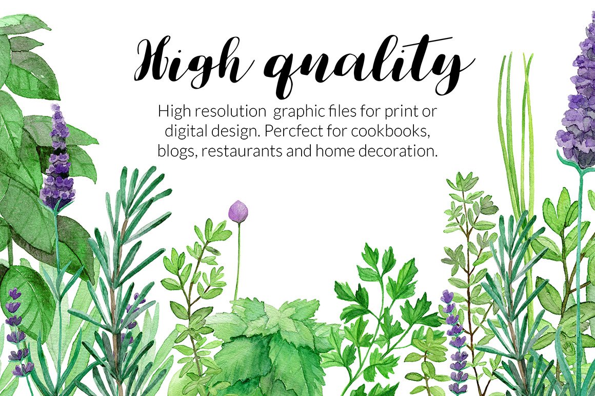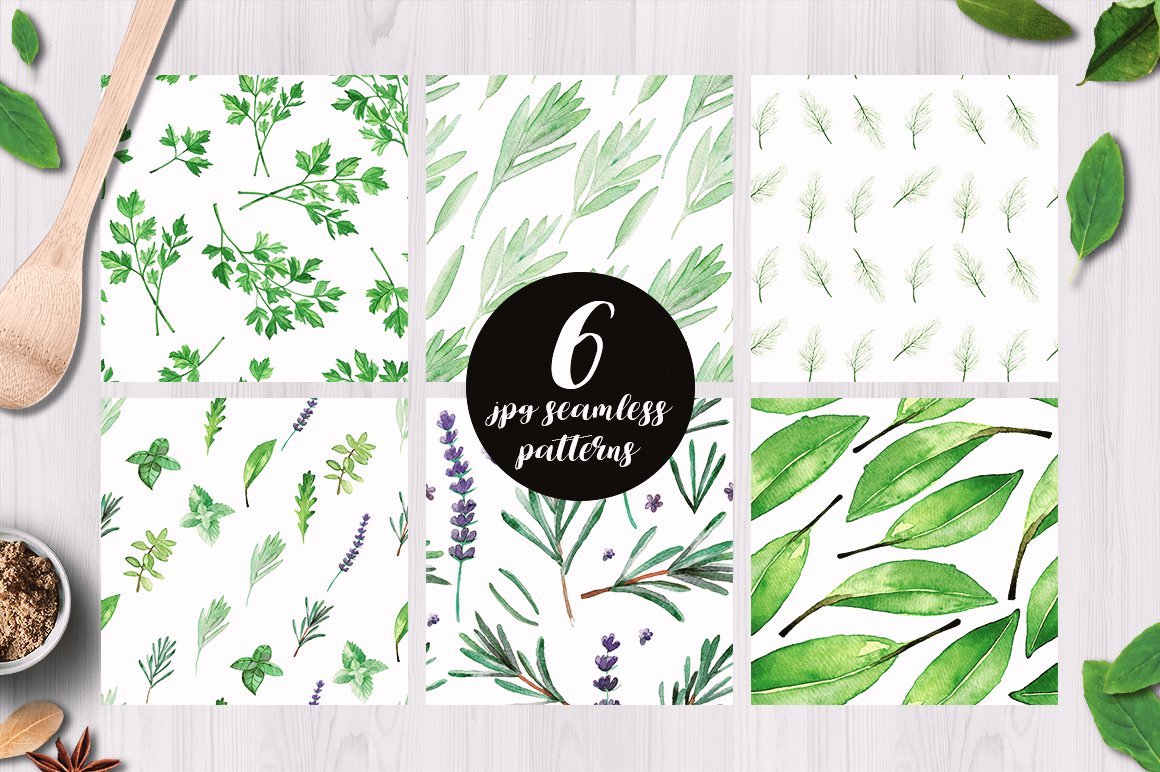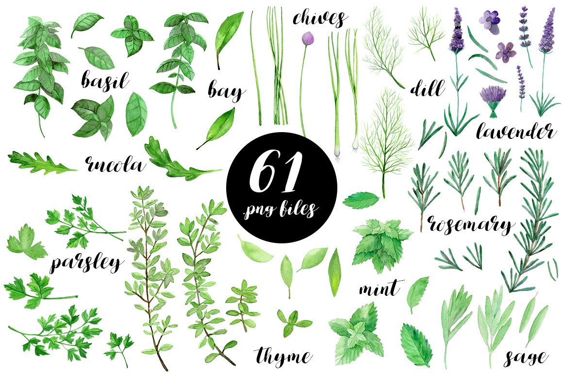 I am very happy to introduce to you the Culinary Herbs Watercolor Set. It has been hand painted with watercolor. All the elements are plants you could find in your kitchen garden: parsley, dill, chive, lavender, bay leaves, thyme, sage, rosemary, rucola, basil, mint. You will also find premade, ready to use compositions (wreaths), backgrounds and patterns. This set is perfect for all food-themed designs like packaging, restaurant menus, culinary blogs or cookbooks. It will also look very good when used as home decoration elements.