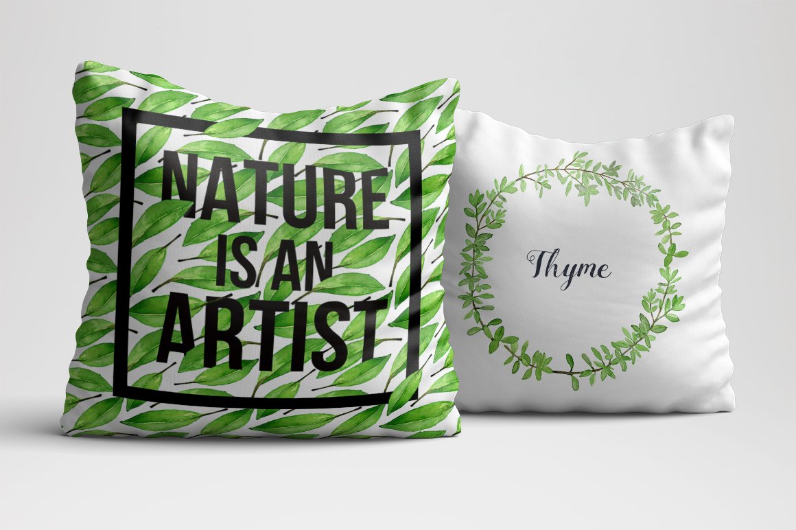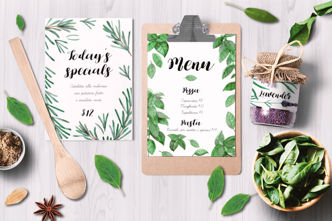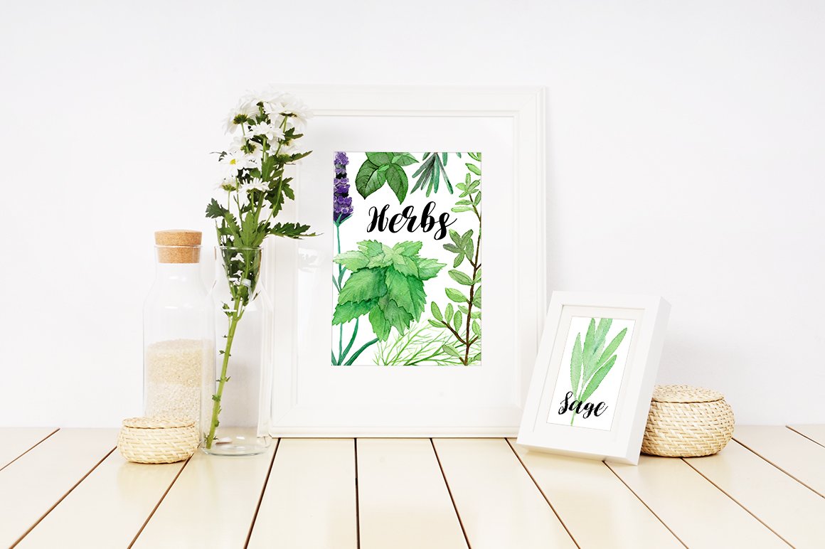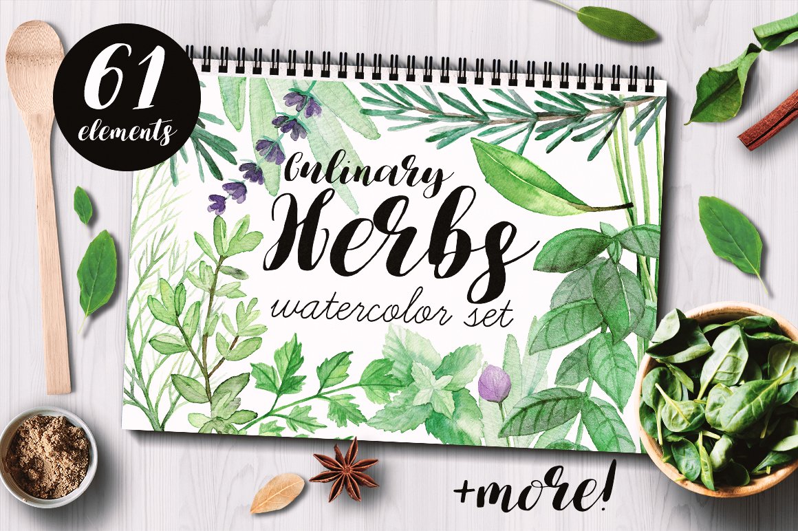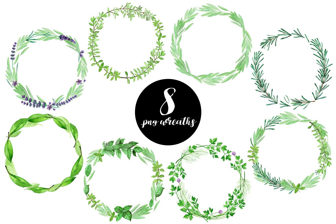 I am very happy to introduce to you the Culinary Herbs Watercolor Set. It has been hand painted with watercolor. All the elements are plants you could find in your kitchen garden: parsley, dill, chive, lavender, bay leaves, thyme, sage, rosemary, rucola, basil, mint. You will also find premade, ready to use compositions (wreaths), backgrounds and patterns. This set is perfect for all food-themed designs like packaging, restaurant menus, culinary blogs or cookbooks. It will also look very good when used as home decoration elements.