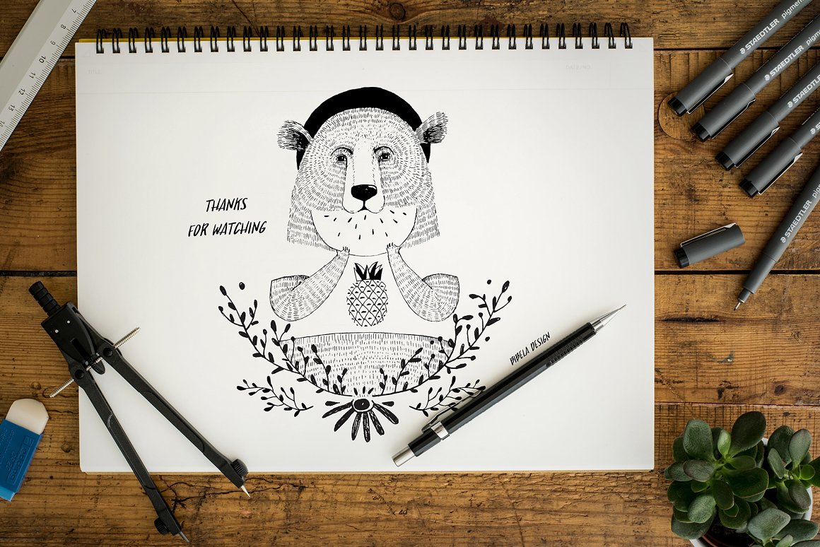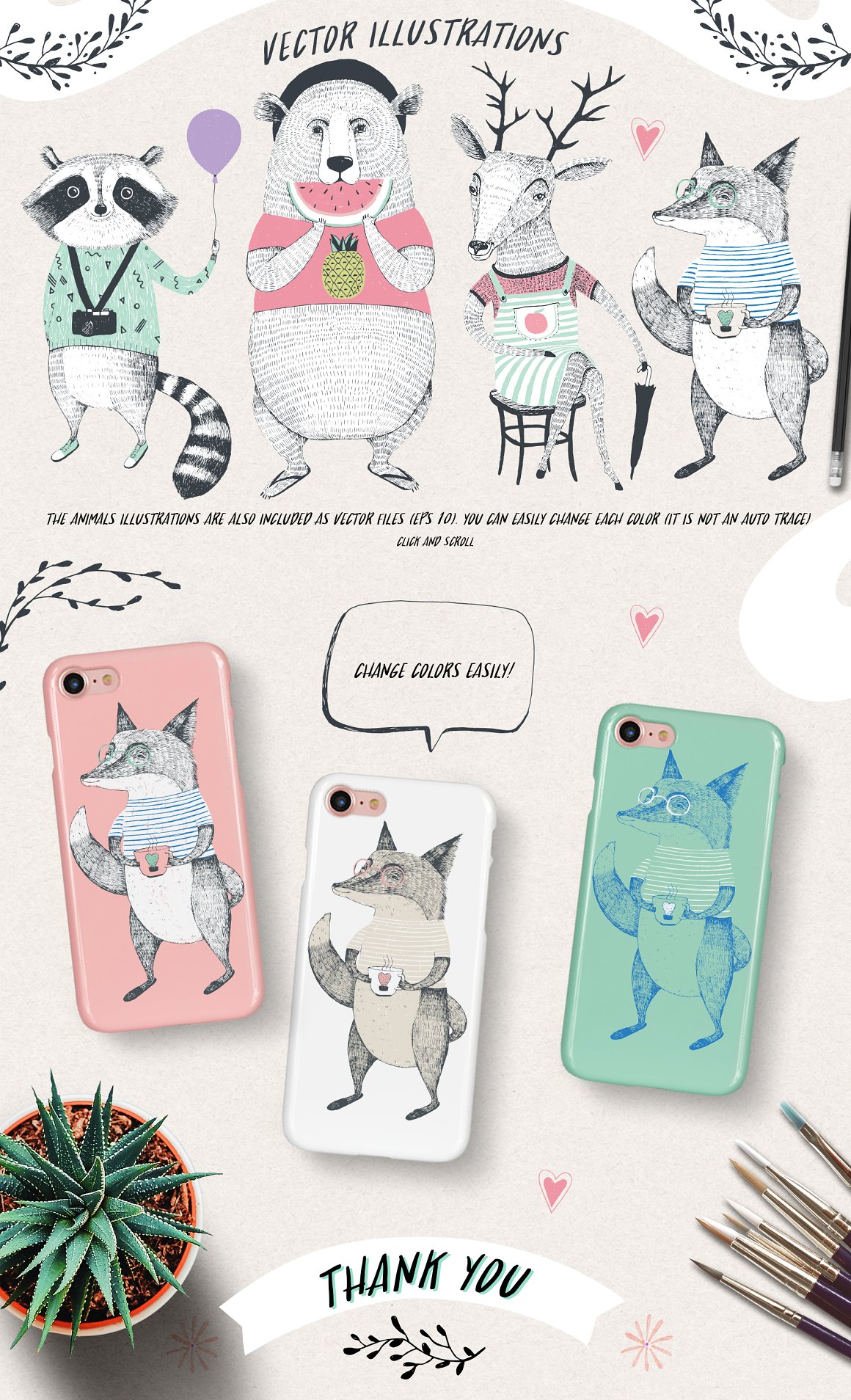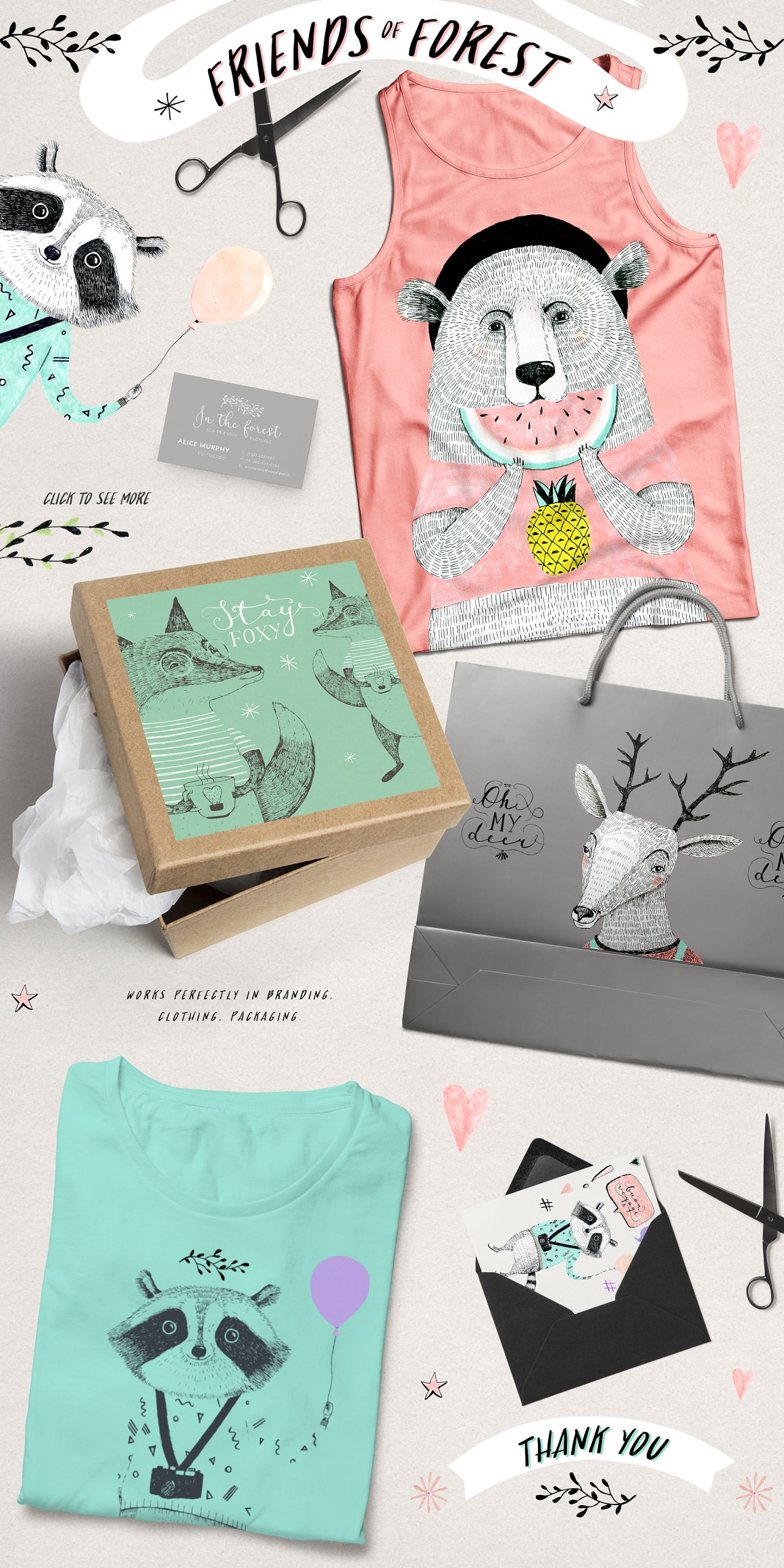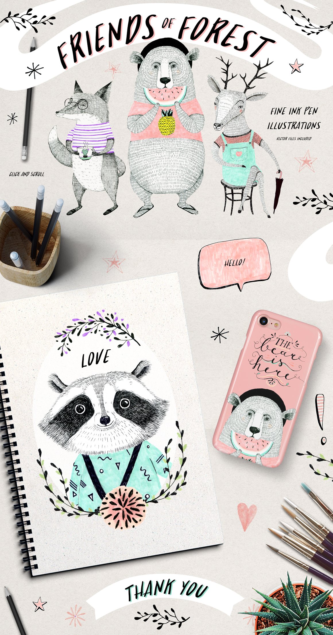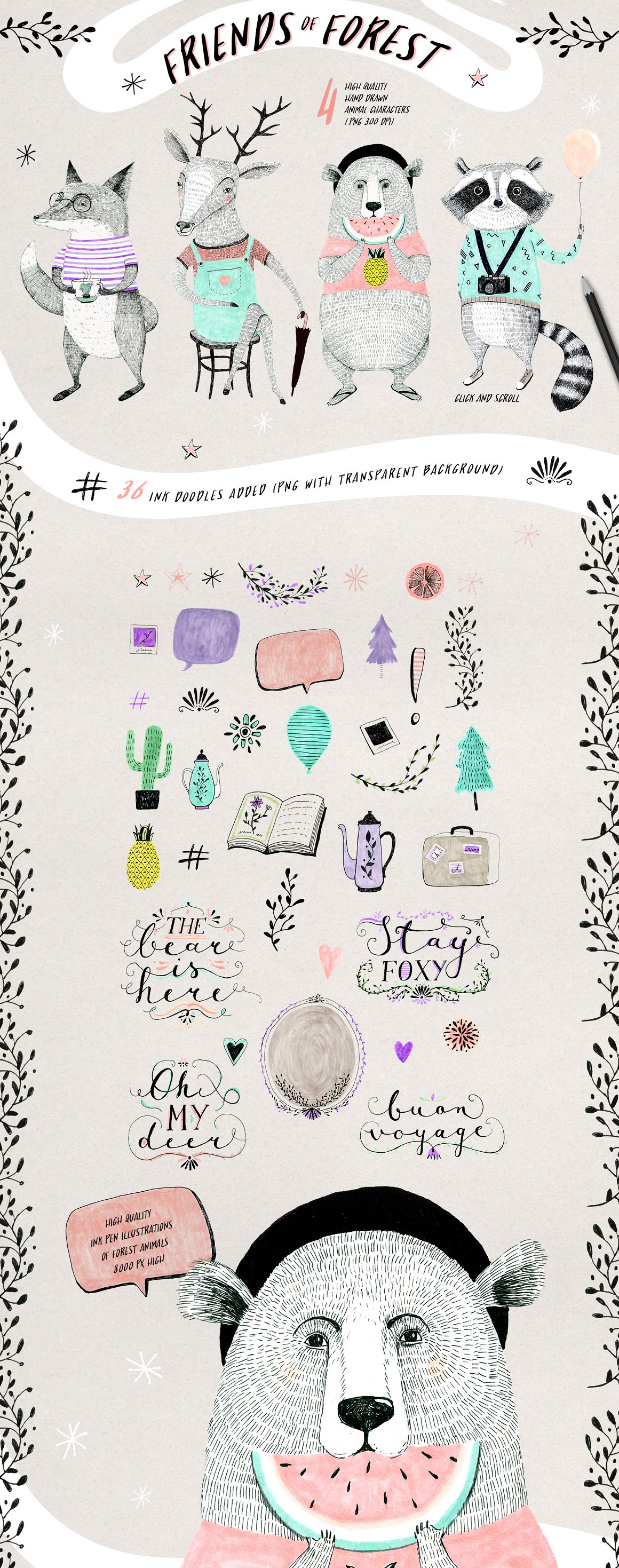 Introducing the new set of illustrations: FRIENDS OF FOREST. This collection is based on 4 high quality, original, hand drawn, ink illustrations (bear, deer, fox, racoon). I have included also some doodles to make your designs even more fun! All of the animals illustrations are also included as vectors. They are NOT auto trace vectors. They have been carefully vectorised one colour layer at a time. This gives you a chance to easily manage the colors (one color = one layer) Perfect for fashion, posters, cards. Enjoy!!!