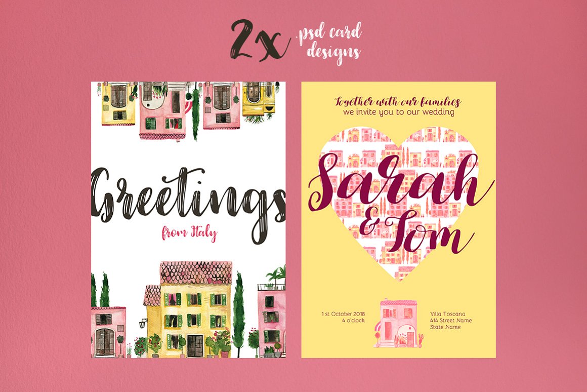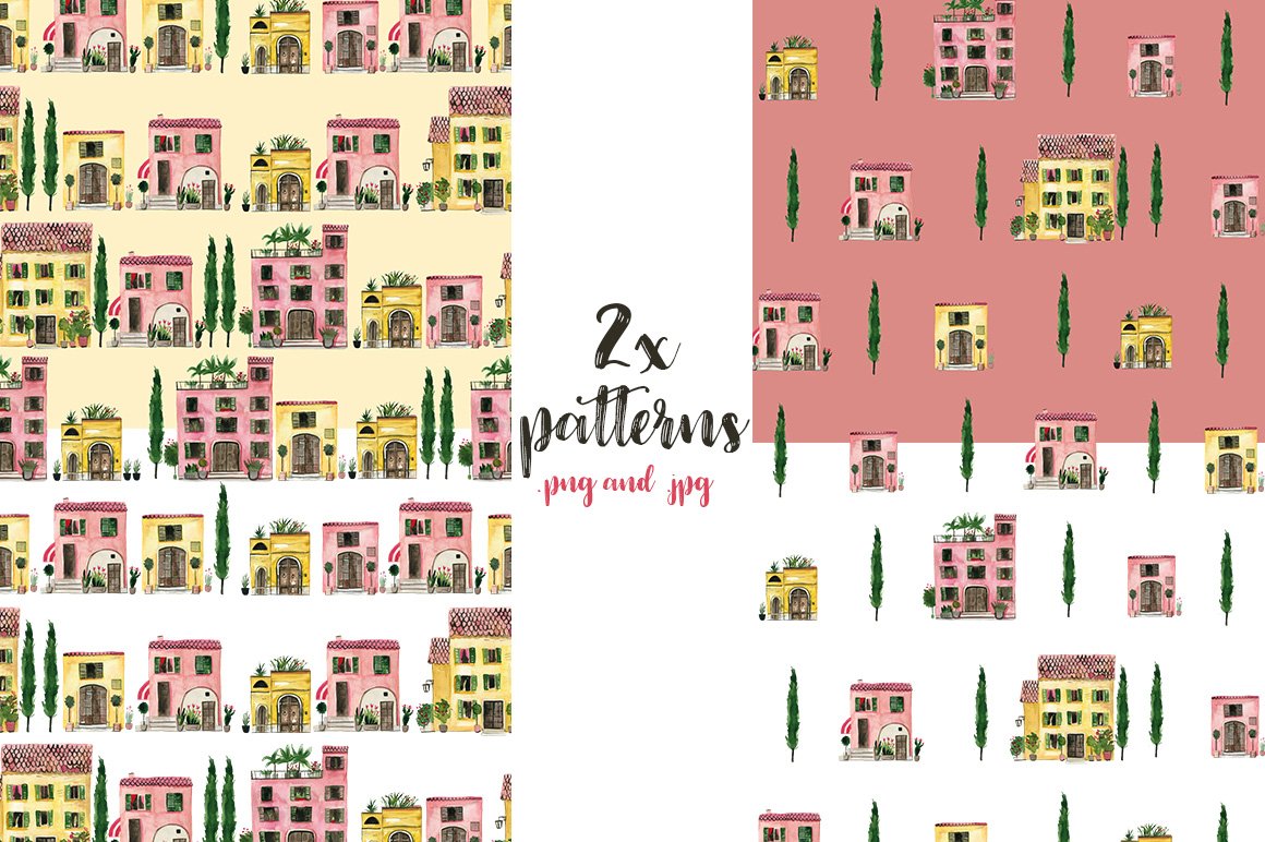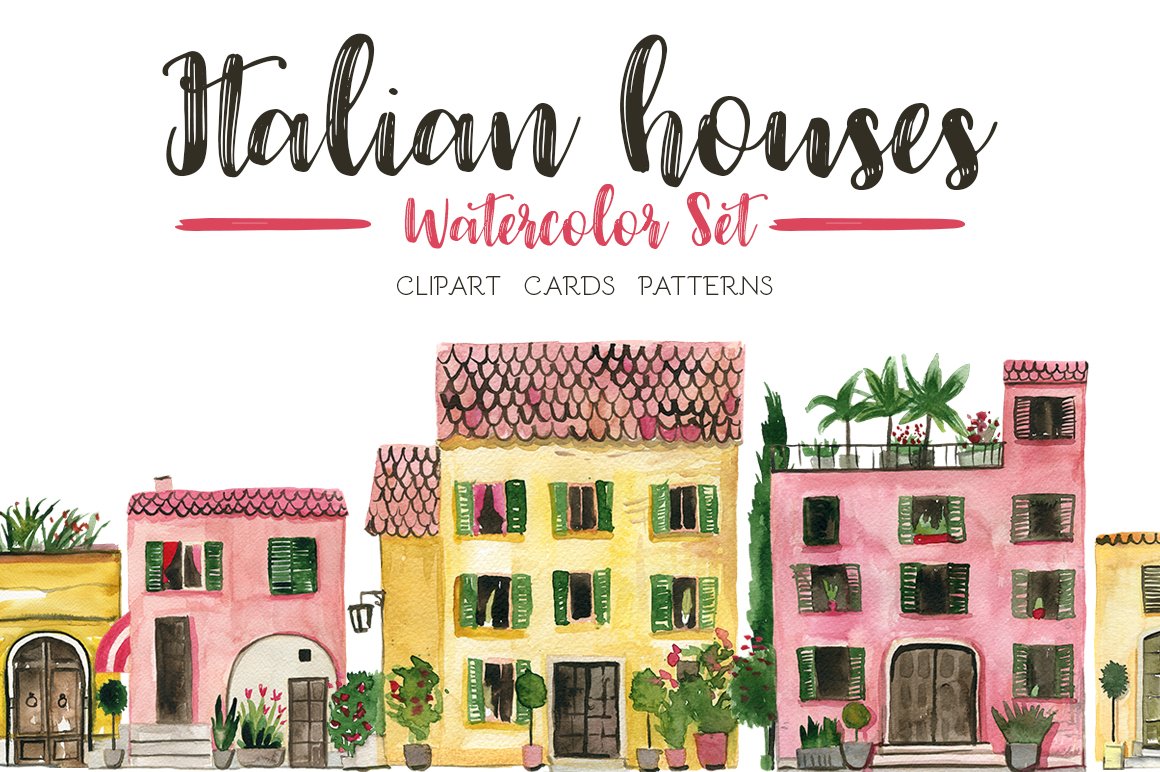 This time I would like to share with you some of my holiday memories! I am very happy to introduce to you the Italian Houses Watercolor Set. It has been hand painted with watercolor after my trip to Tuscany. It can be used in cards, posters, books but also as decoration elements.