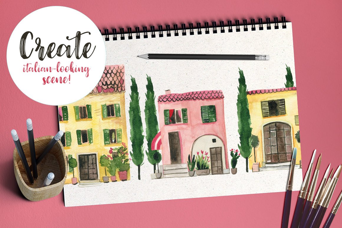 14. Italian Houses Watercolor Set from Bibela