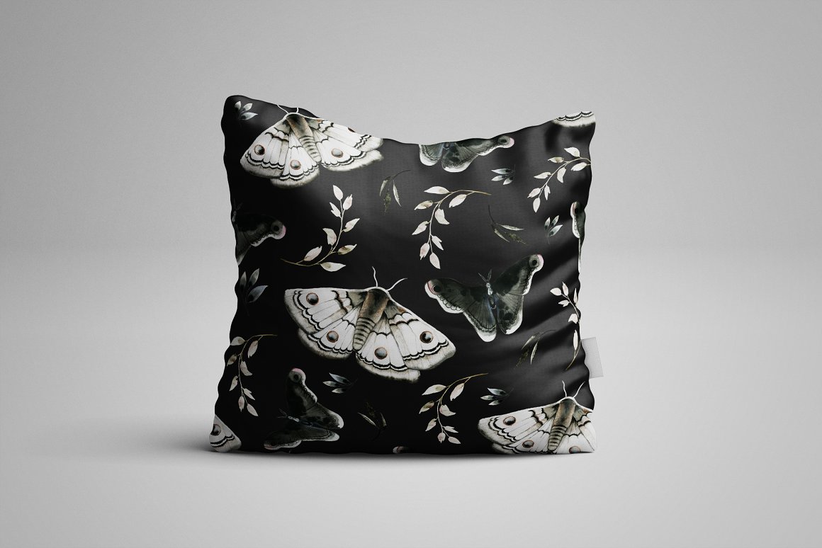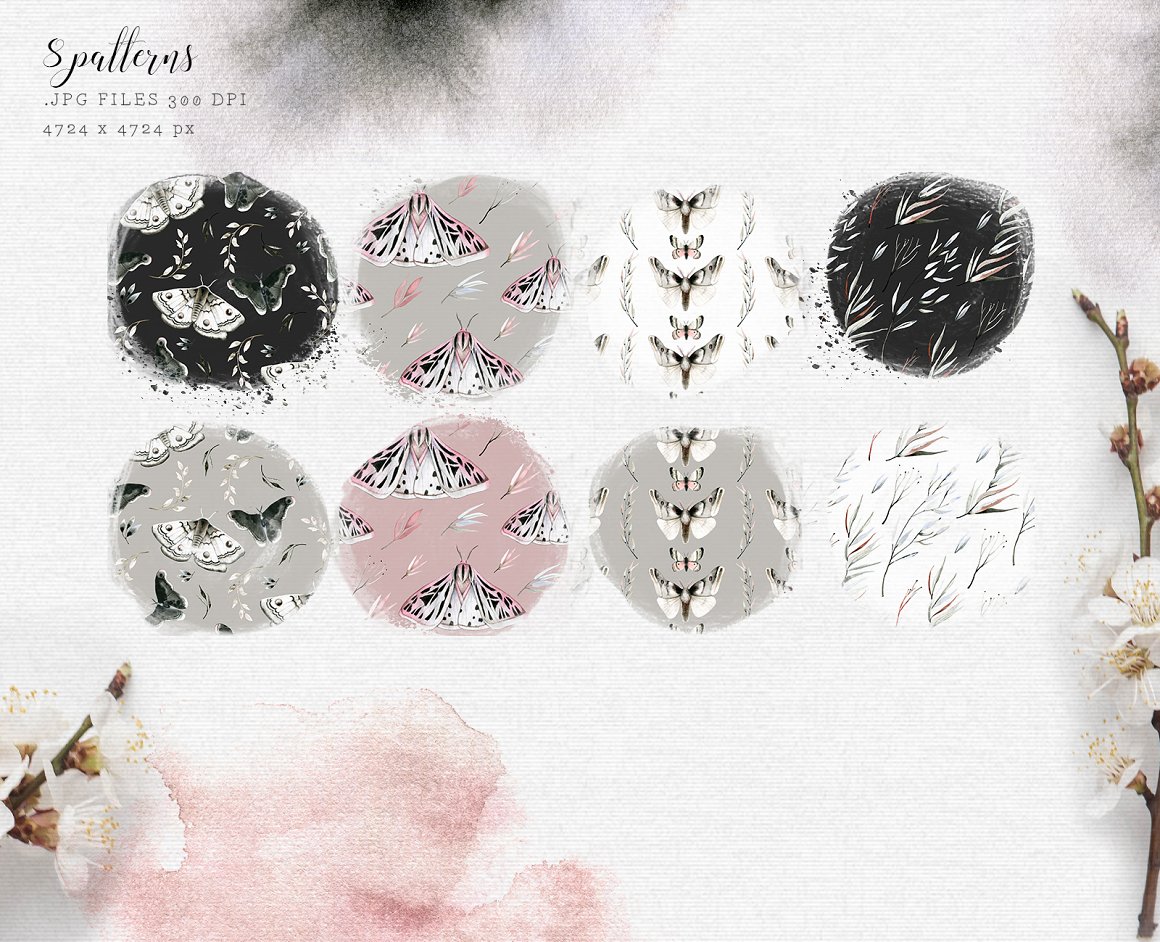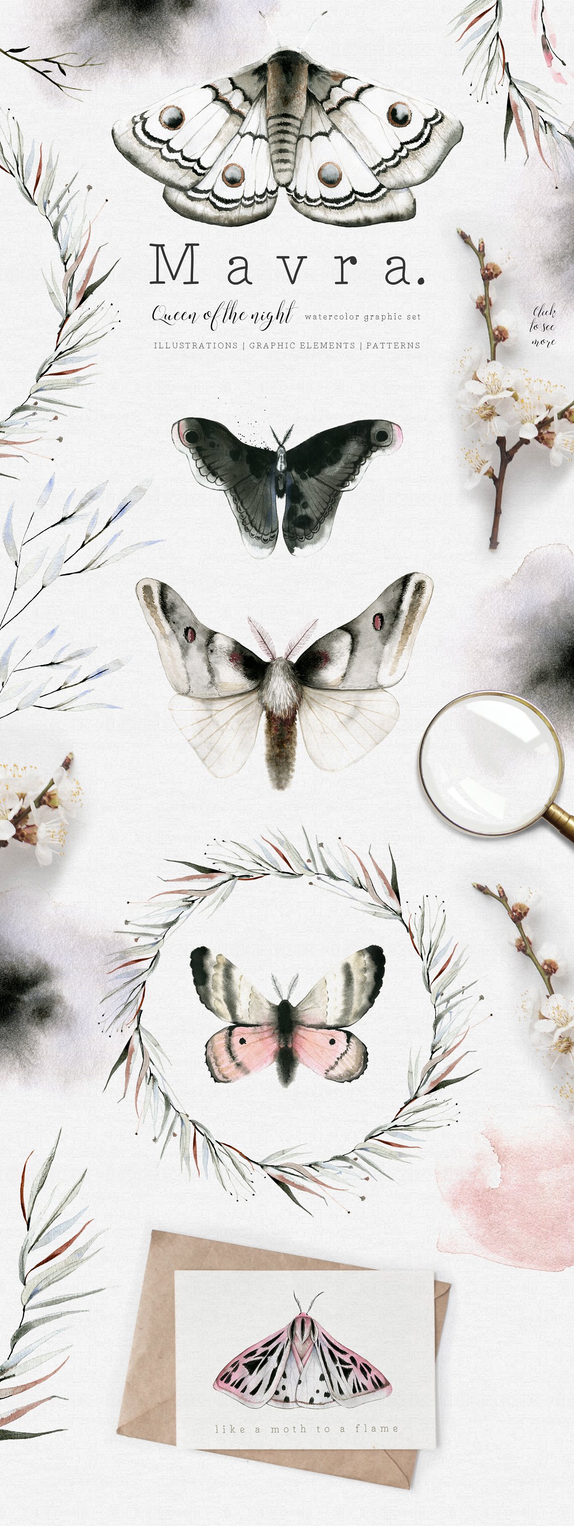 Introducing to you MAVRA. A moody and dark watercolor graphic set inspired by nightlife. It has been hand painted with watercolor and ink. You will find here high quality clipart – moths and other elements. Also you will find ready to use seamless patterns, wreaths, backgrounds.