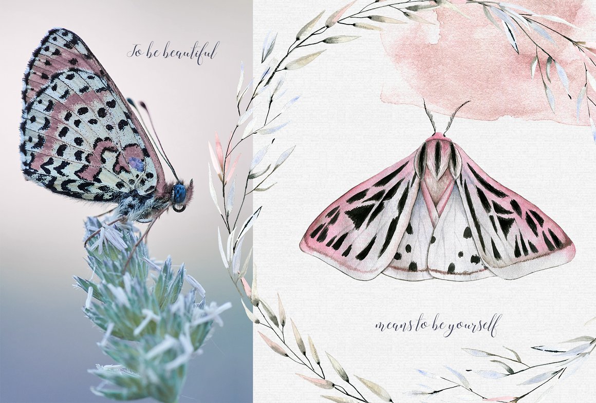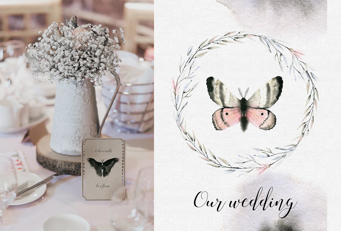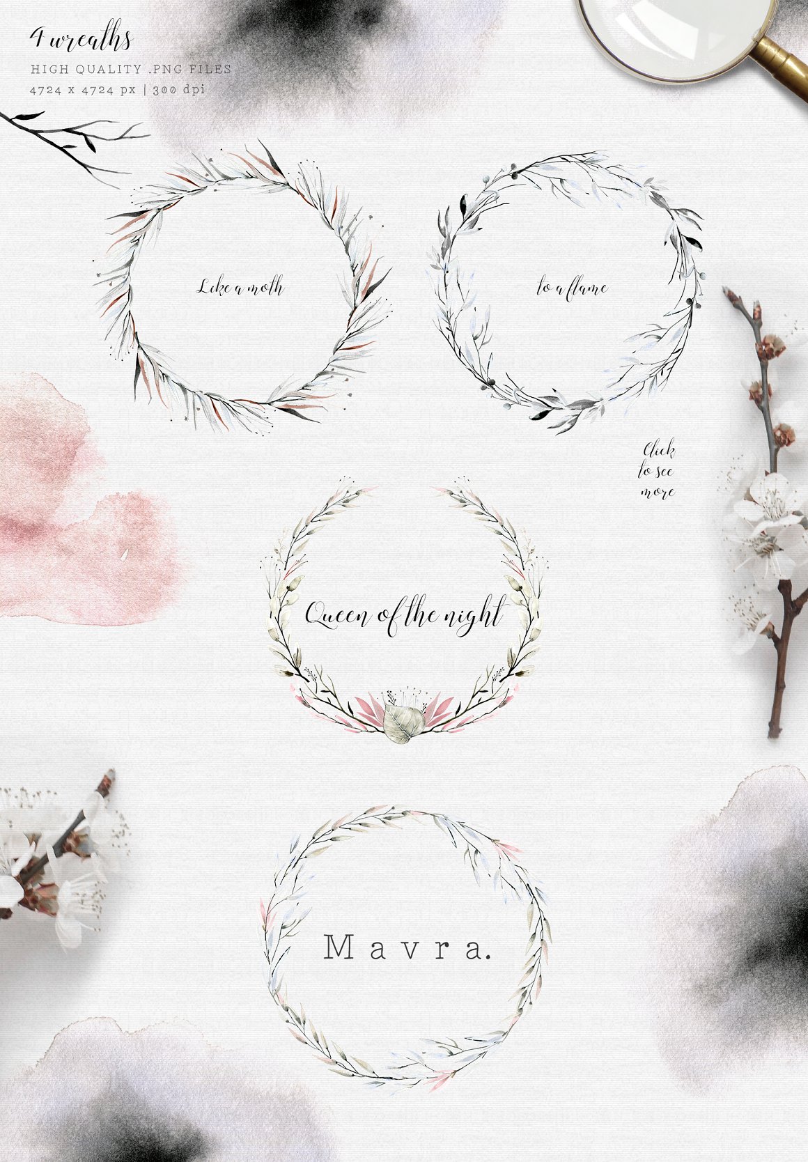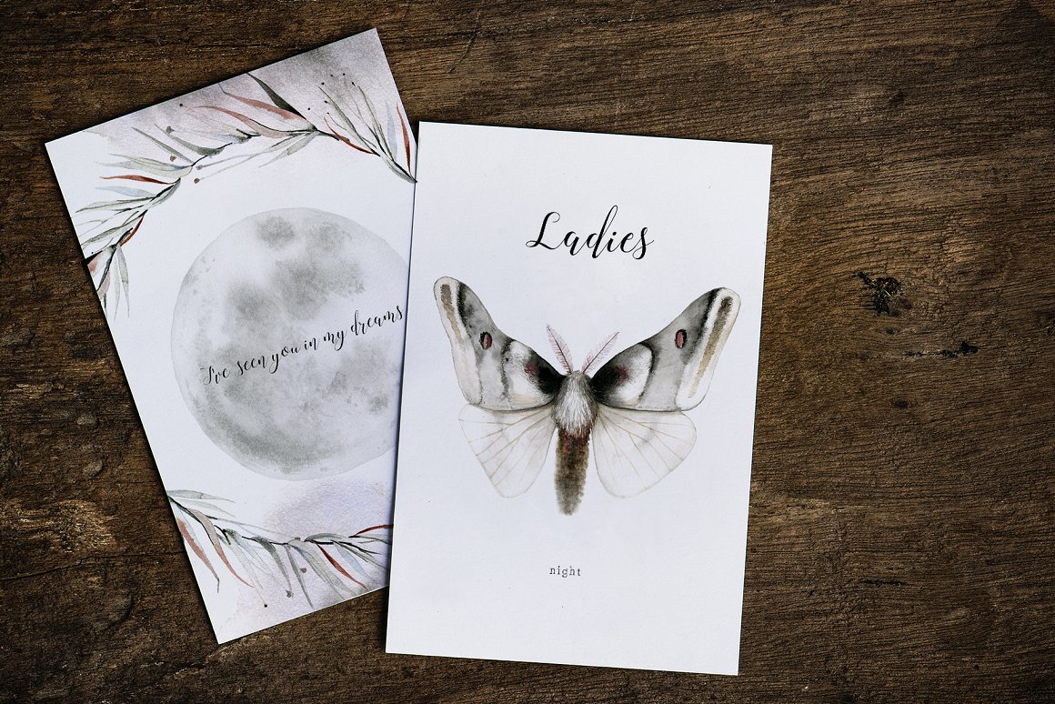 Introducing to you MAVRA. A moody and dark watercolor graphic set inspired by nightlife. It has been hand painted with watercolor and ink. You will find here high quality clipart – moths and other elements. Also you will find ready to use seamless patterns, wreaths, backgrounds.