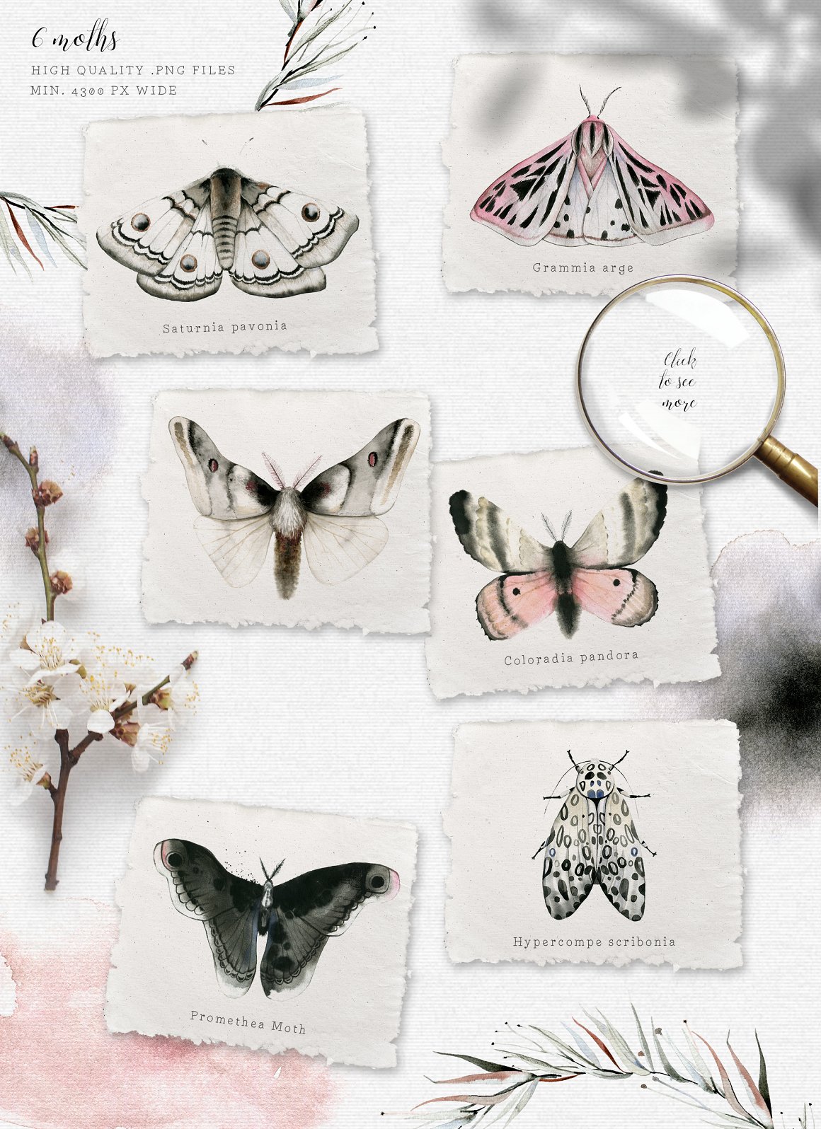 8 x .PNG watercolor MOTHS (300 dpi with transparent background):