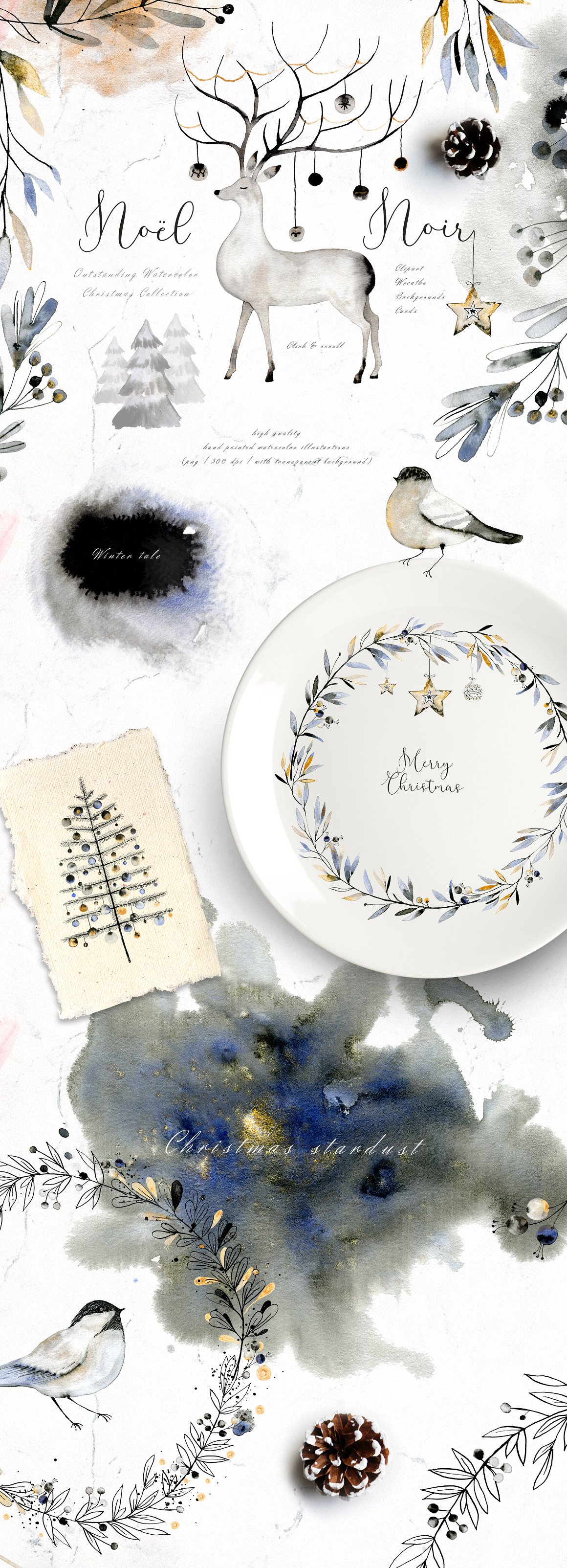 I am very happy to introduce to you the Noël Noir Watercolor Christmas Set. It has been hand painted with watercolor and ink. You will find here high quality clipart and predesigned cards & wreaths. It has a dark look with a touch of gold.