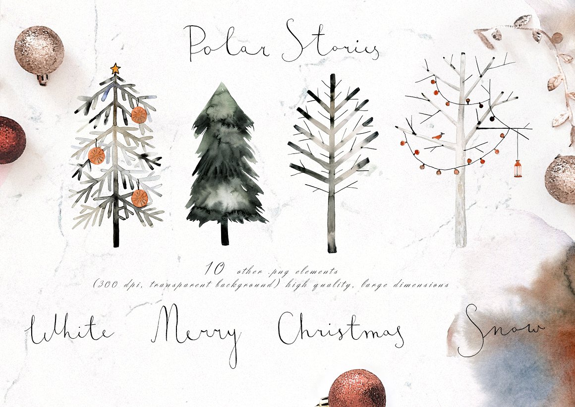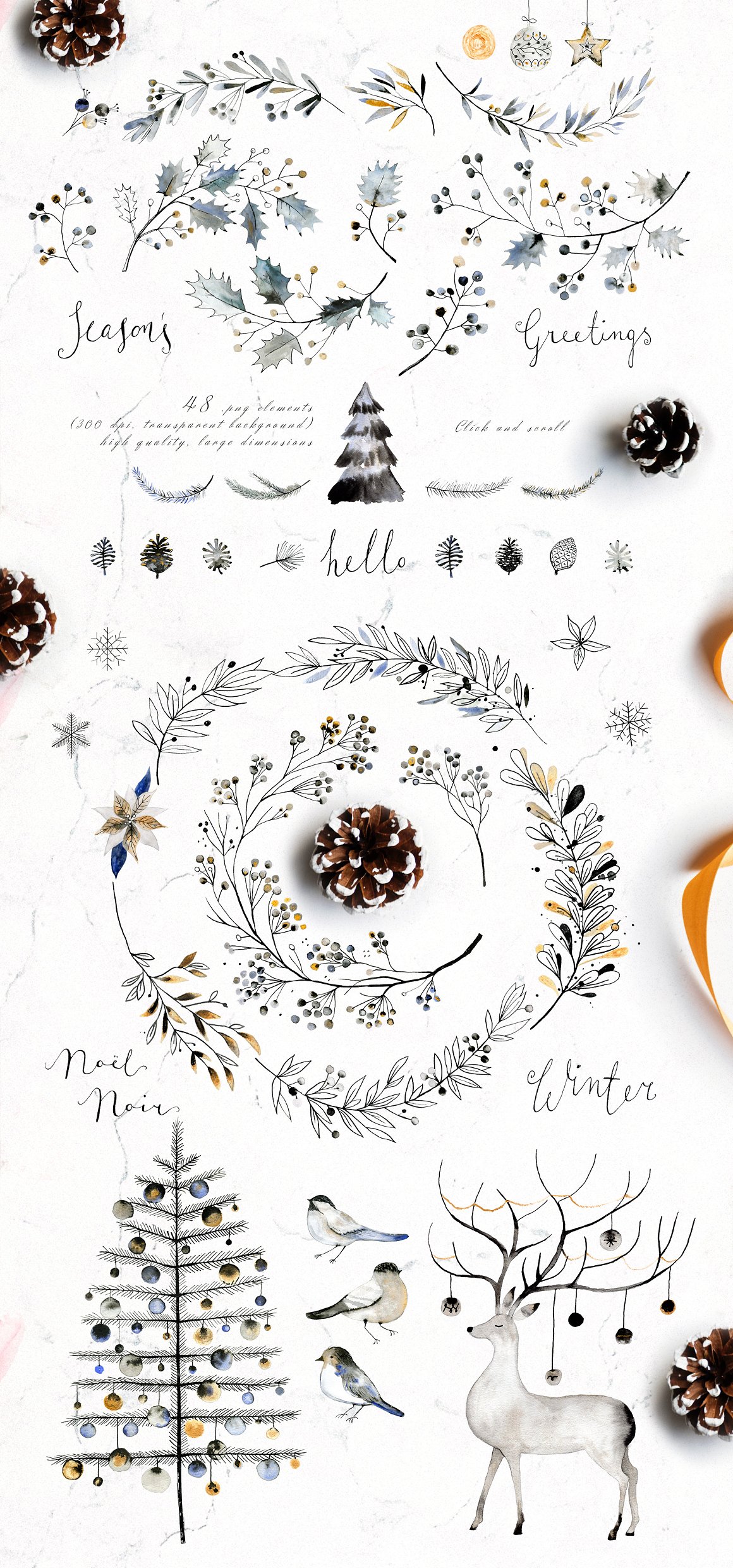 48 x .PNG watercolor ELEMENTS (300 dpi with transparent background): (floral elements, flakes, Christmas tree, Christmas deer, winter birds, typography)