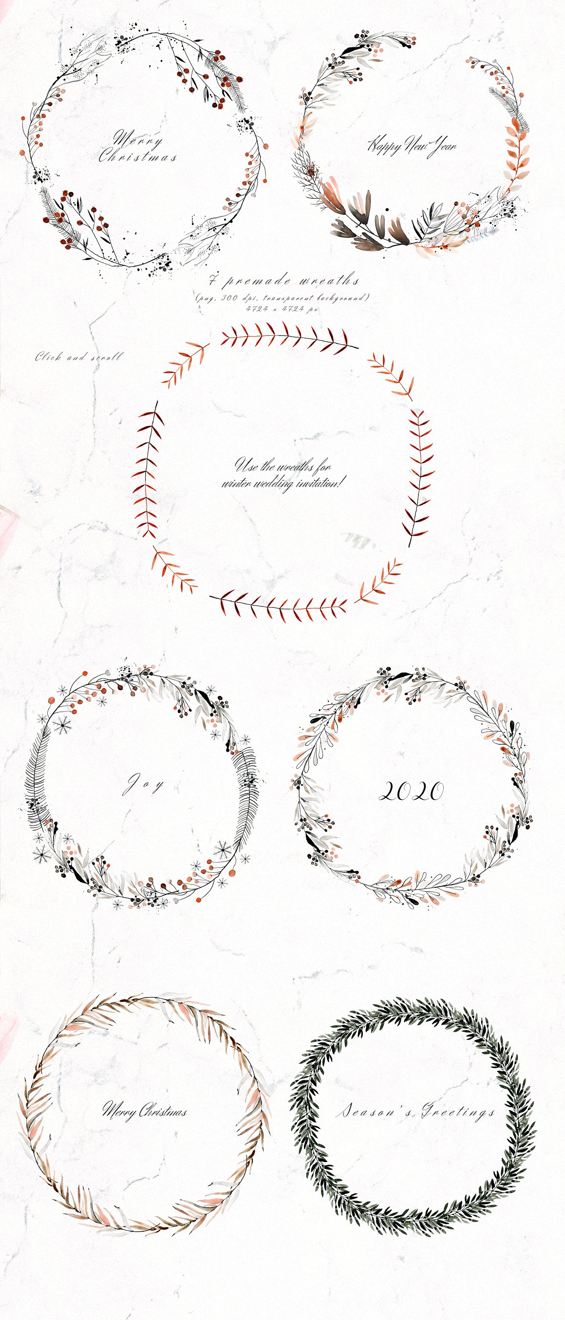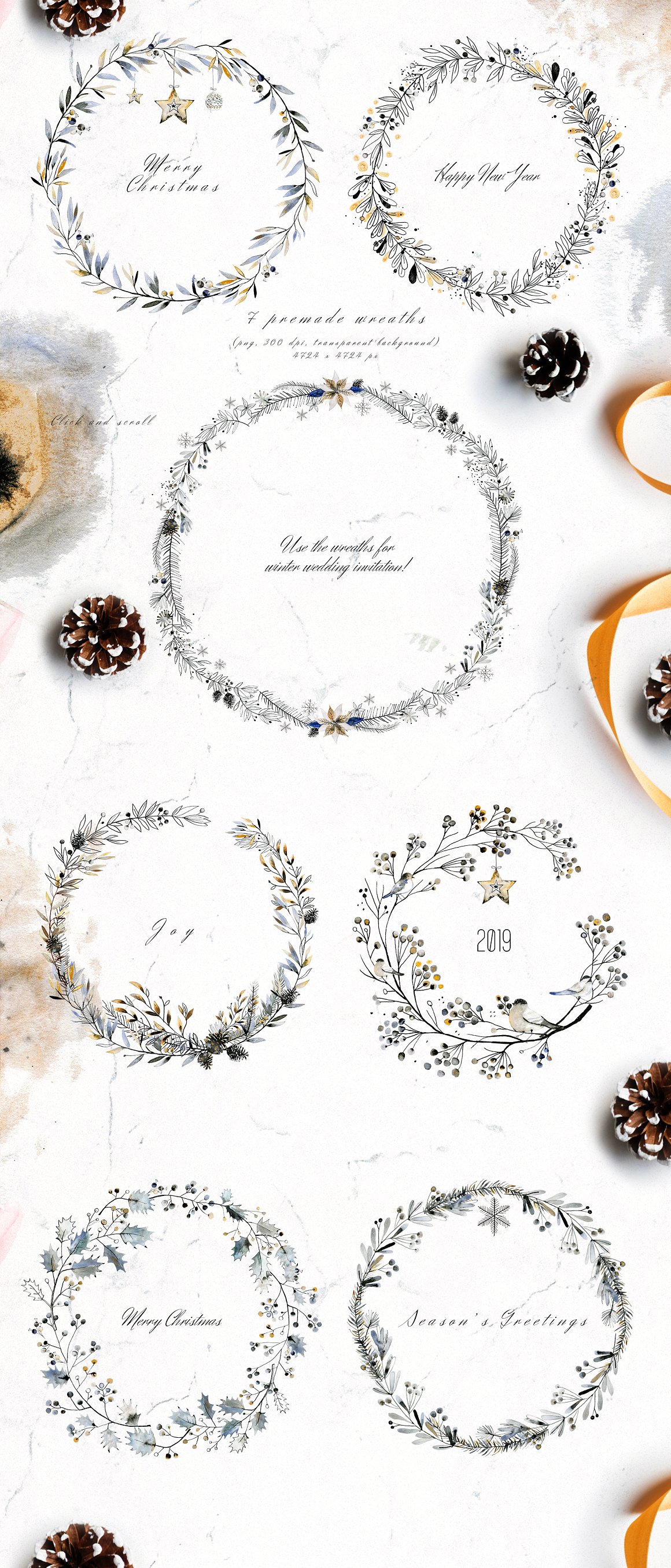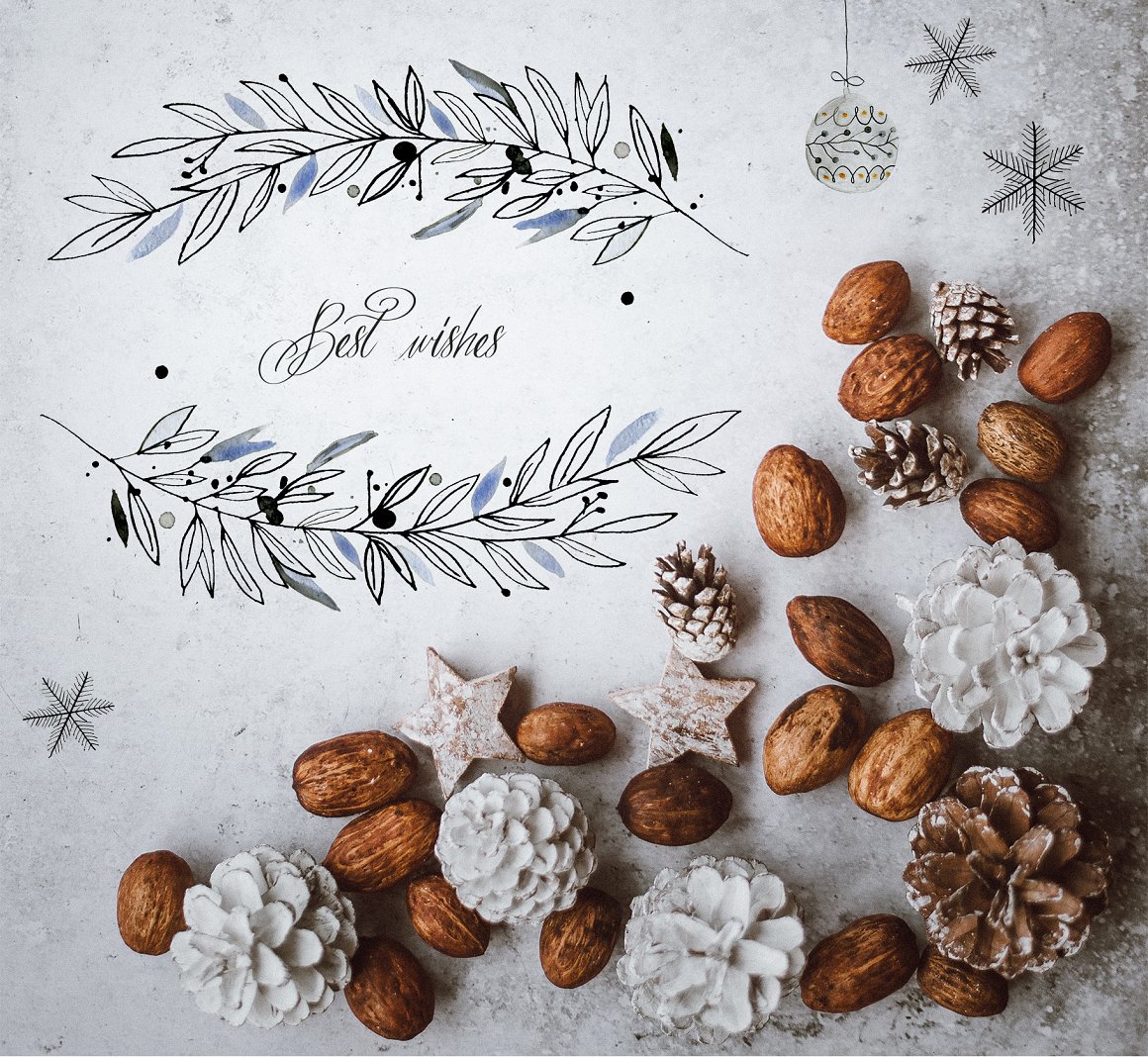 This set is perfect for Christmas designs but it will work perfectly for weddings, cards, packaging, blogs and as home decoration elements.