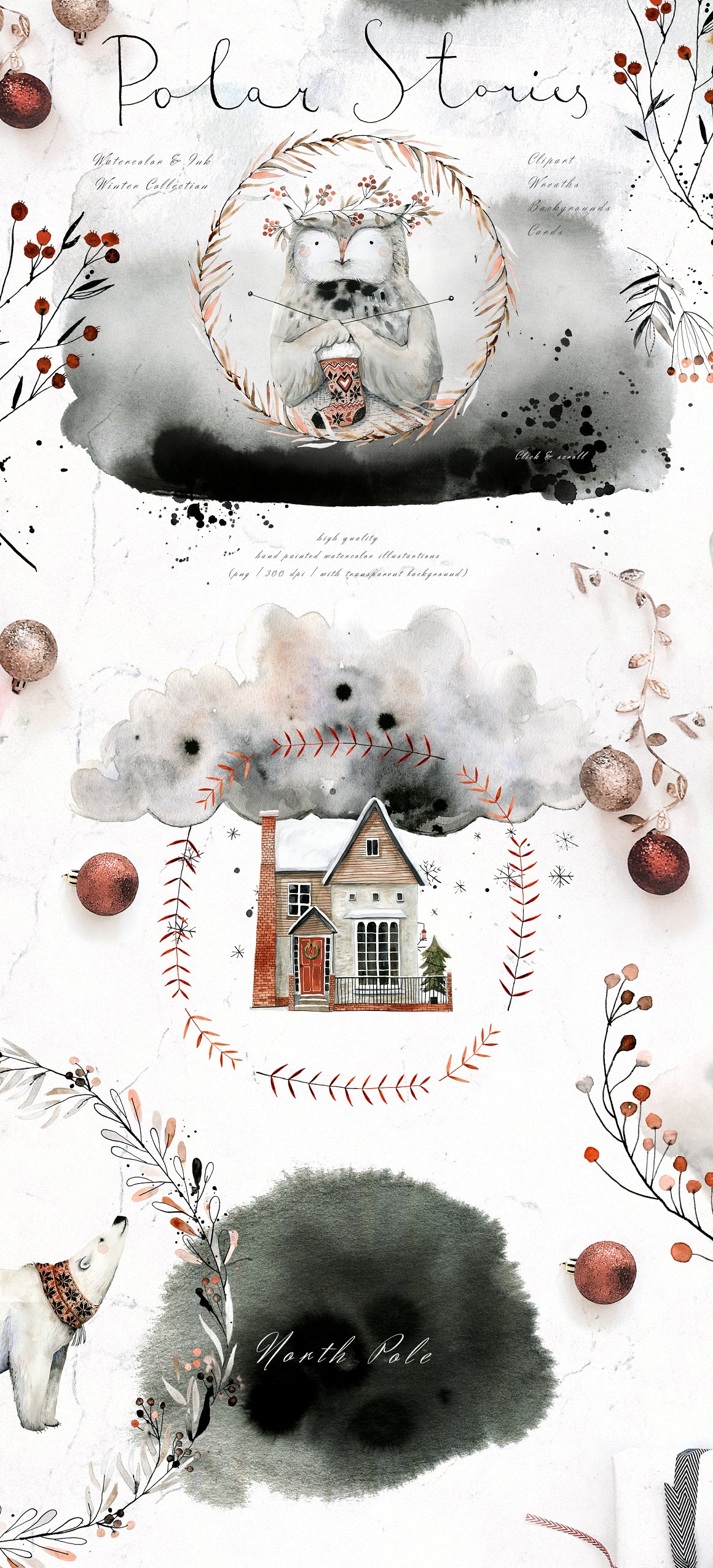 I am very happy to introduce to you the Polar Stories Set. It has been hand painted with watercolor and ink. You will find here high quality clipart and predesigned cards and wreaths. It has a dark look with a touch of red.