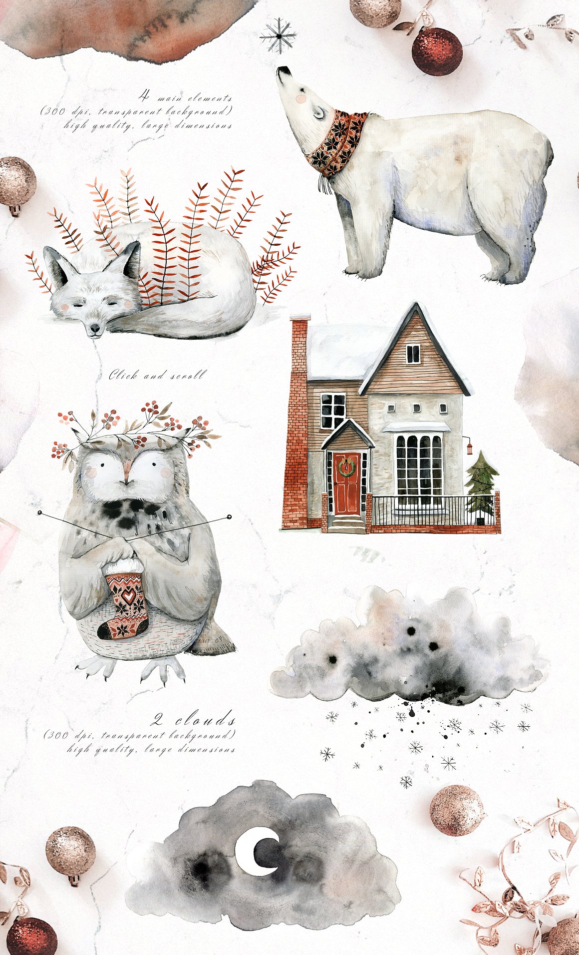 36 x .PNG watercolor ELEMENTS (300 dpi with transparent background): (animals, house, floral elements, flake, trees, clouds, typography)