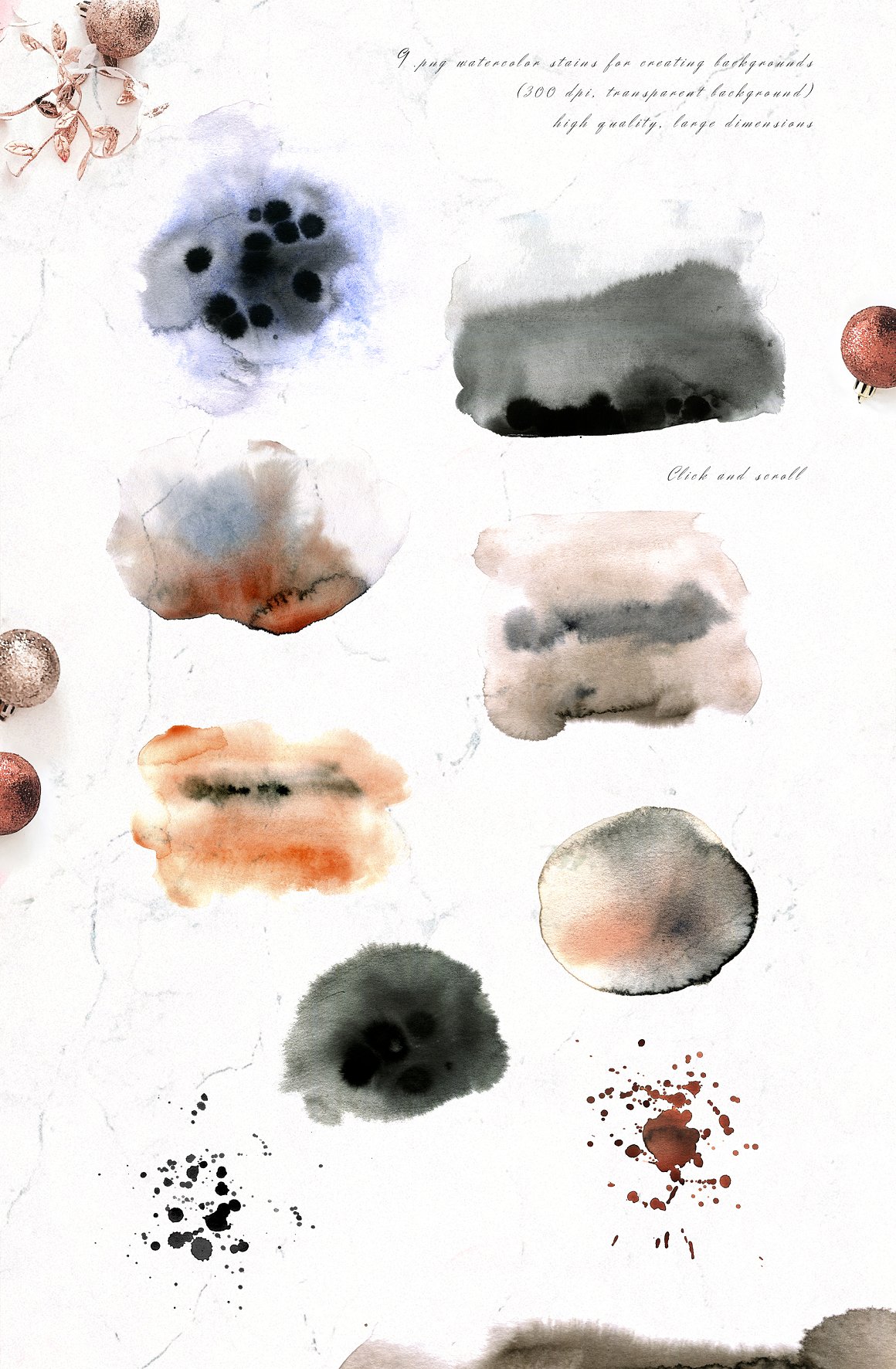 12 x .PNG watercolor ELEMENTS (300 dpi) with transparent background: