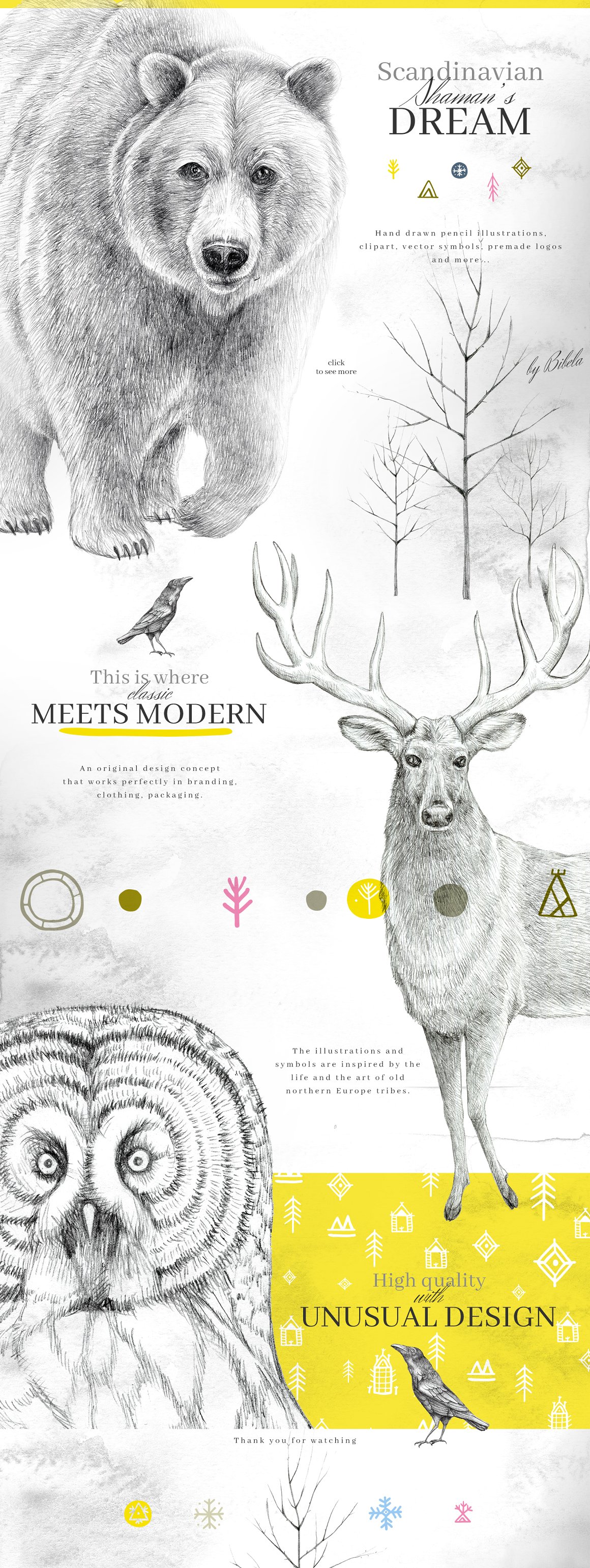 Introducing the new Scandinavian Shaman’s Dream set. It is a unique combination of classical pencil drawings and modern design. This collection has been inspired by the life and art of northern Europe tribes. Perfect for branding, packaging and fashion. You can use/edit the pre made logos and mix them with illustrations and patterns. You can also create a winter scenery using the drawings. Enjoy!!!