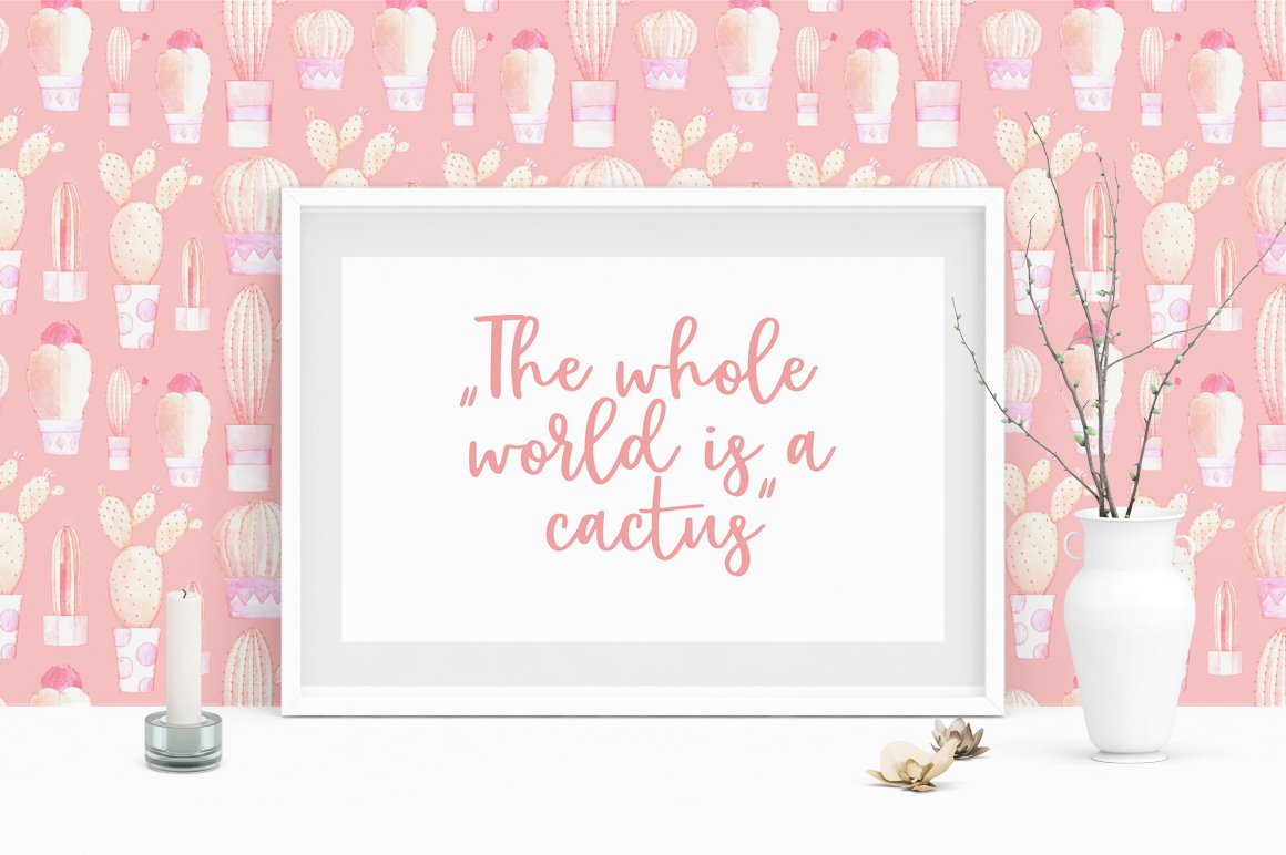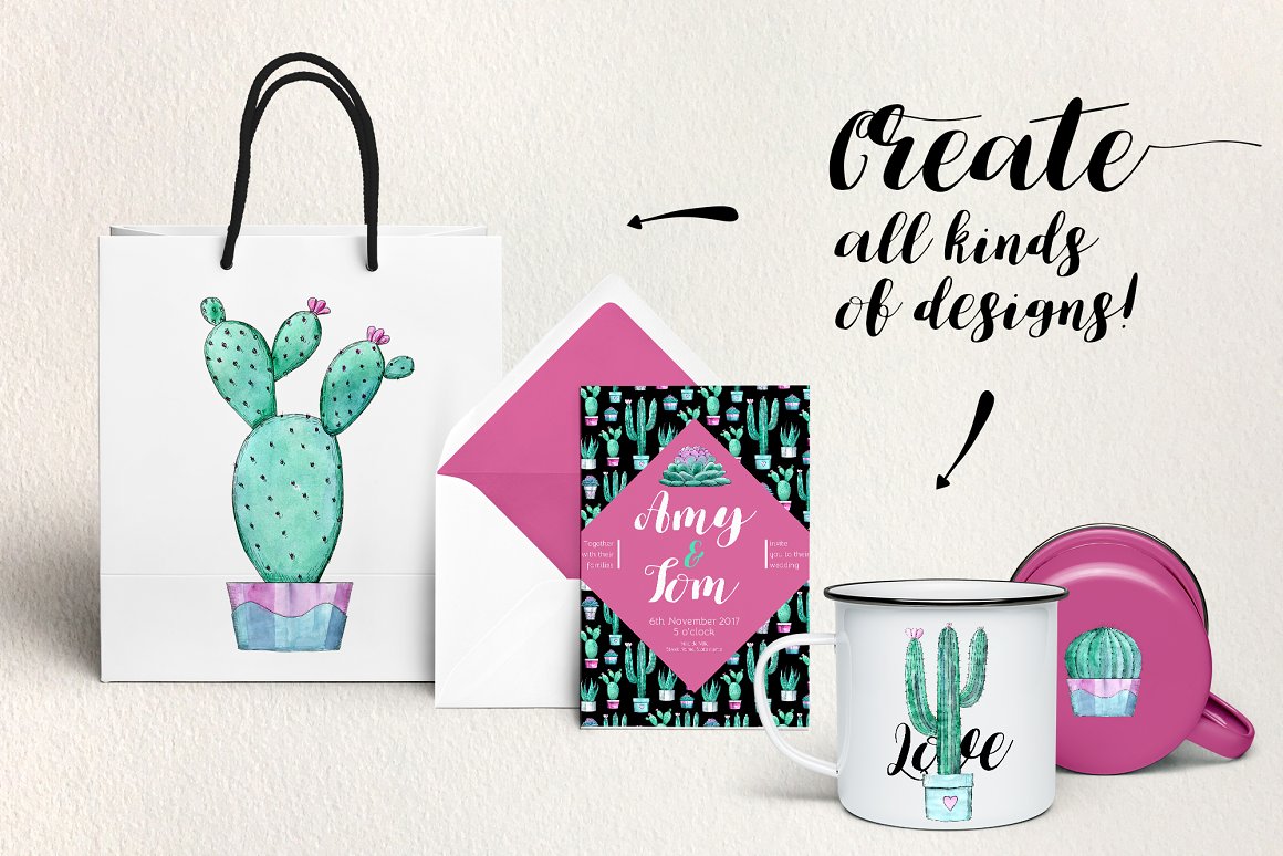 The work has been created from hand painted watercolor illustrations of cacti. Perfect for home decoration, wedding invitation or brand identity concept.