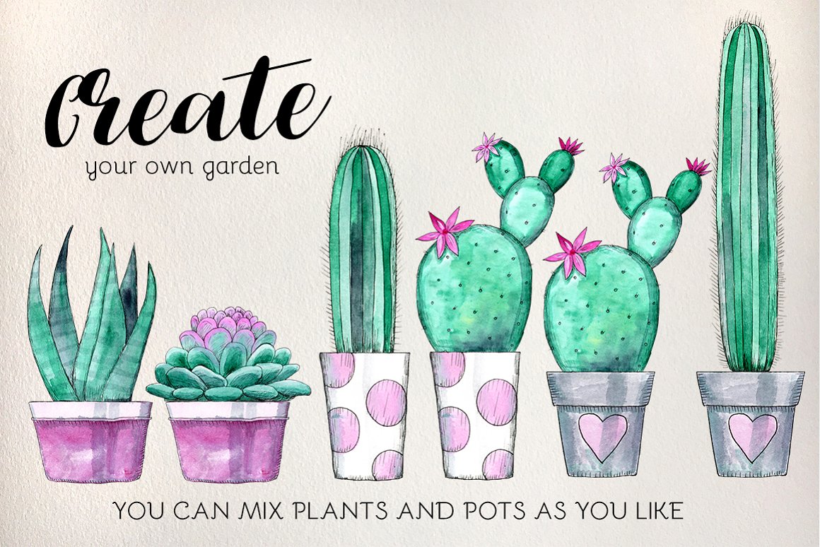 I am very happy to introduce to you the Watercolor Cactus and Succulent Set – one of my favourites. It has been hand created with an ink pen and watercolor. You can mix pots and plants the way you like. It can be used in cards, posters, books but also as decoration elements.