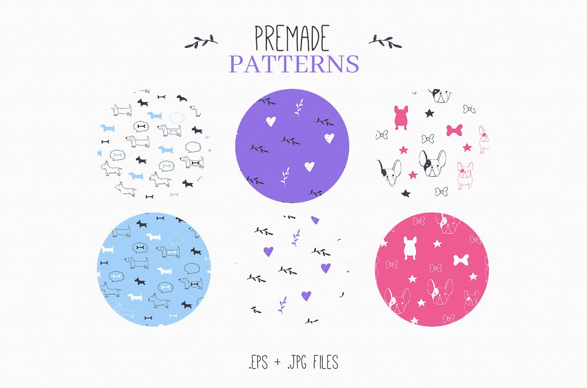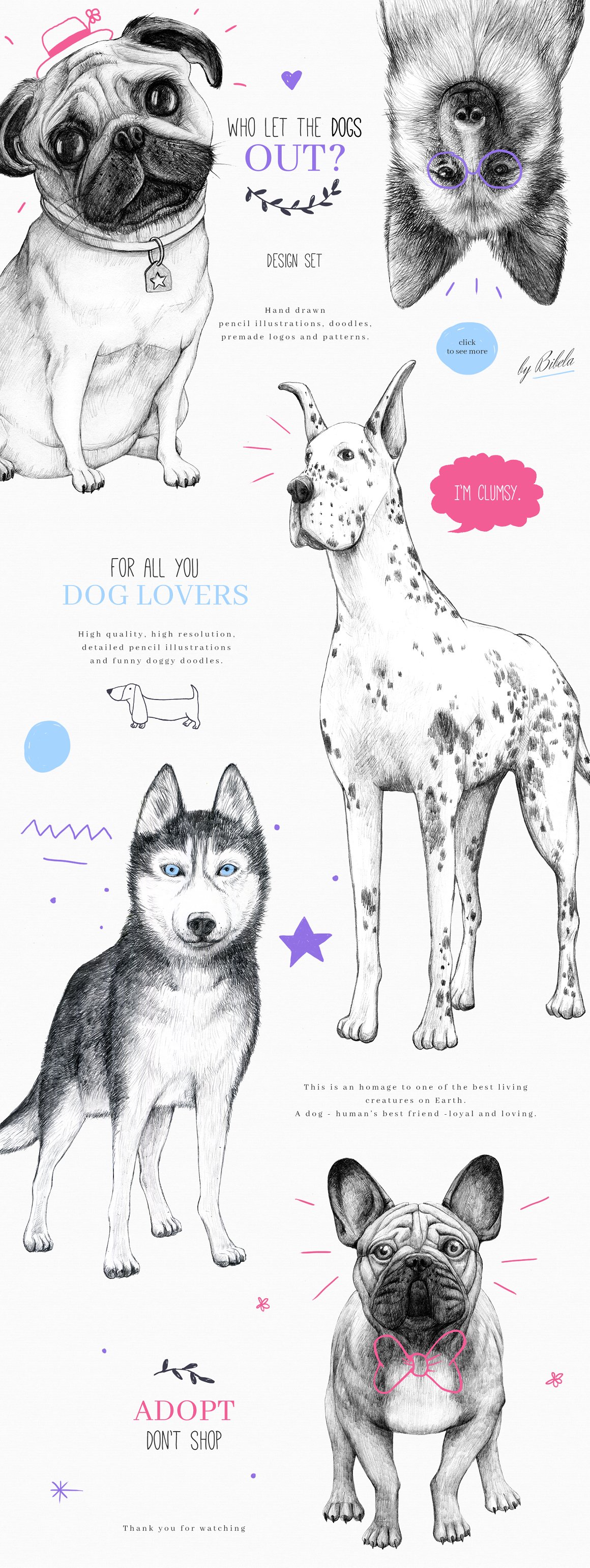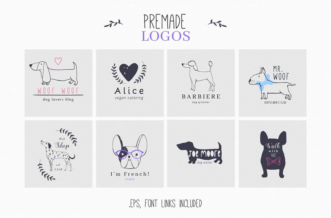 For all you dog lovers out there! Introducing the new Who Let The Dogs Out set. It is a unique combination of classical pencil drawings and fun doodles. Perfect for branding, packaging and fashion. You can use/edit the pre made logos and mix them with illustrations and patterns.