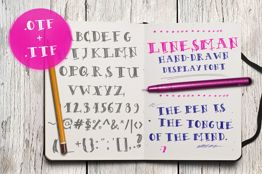 Hello! Let us introduce a ‘Linesman’ Font – the easy way to imitate cool hand-drawn notes. Just look at the screenshots above how you can present your works: sketches, drawings, posters, prints, cards, illustrations, comics and more! Don’t search sketch-focused fonts anymore – just soup your designs up now with ‘Linesman’! ‘Linesman’ Font is available in .ttf as well as .otf format, so you can use it on both Mac & PC. 243 glyphs in total. Just play it with font tester below and discover how fun it is!