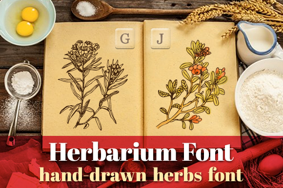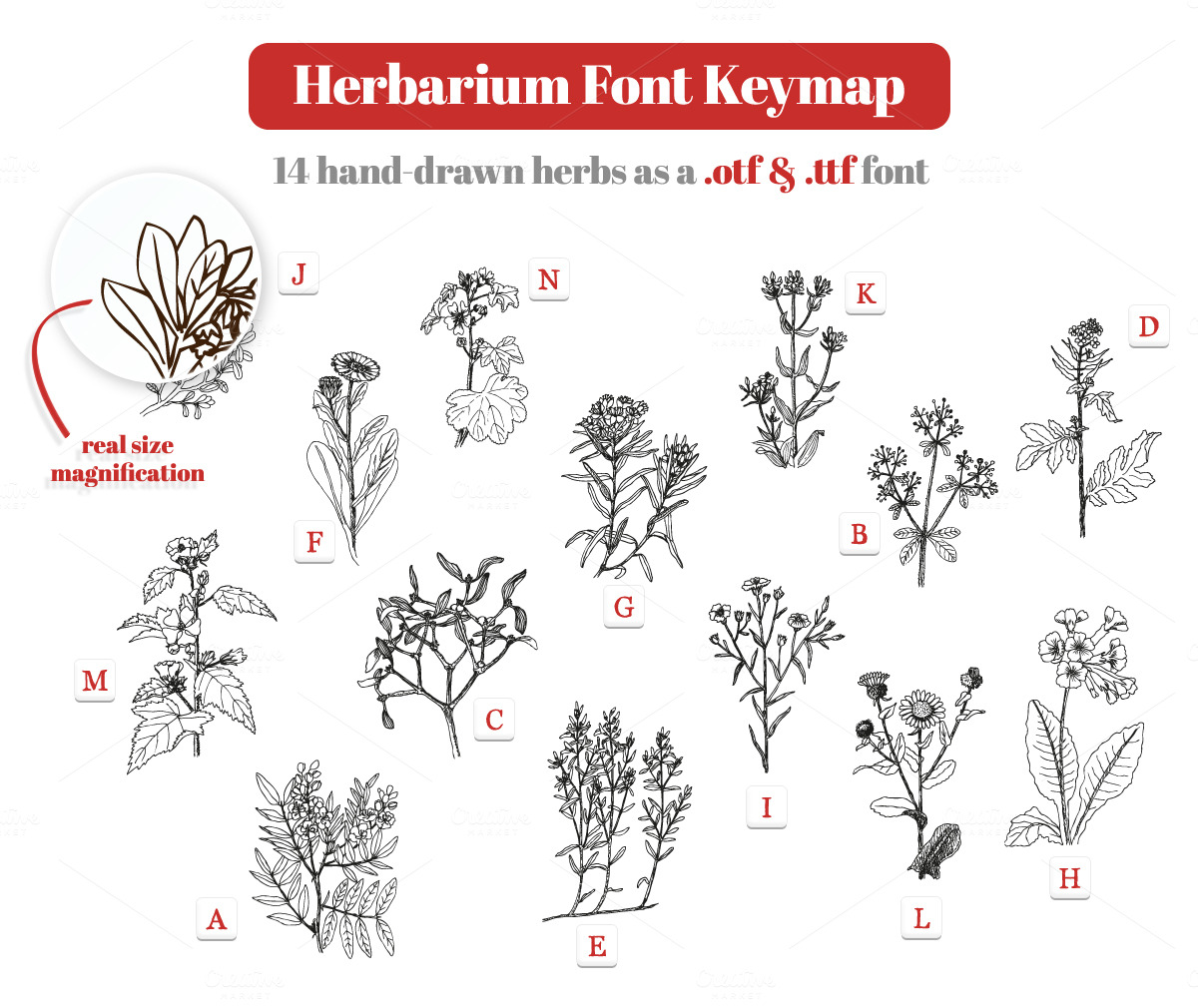 Herbarium Font is a symbol font presenting beautiful, hand-drawn herbs sketches. You can simply place any of 14 herbs by pressing A to N letter on your keyboard (for the keymap please see the 3rd screenshot). Herbs are great addition to your website, poster, card, package, illustration and many others.