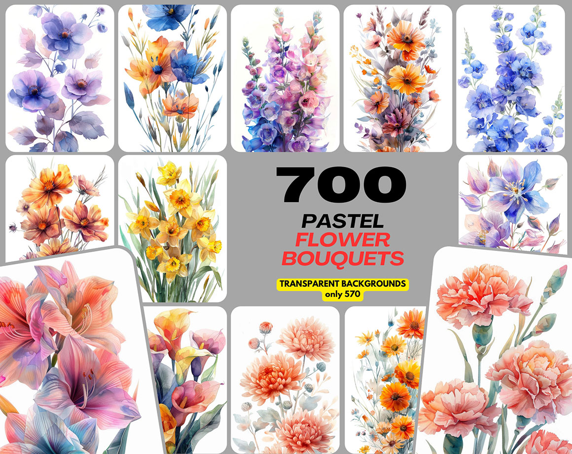 Add elegance and charm to your designs with our Pastel Flower Bouquet Collection—featuring 700 high-resolution JPG images plus 570 images with transparent backgrounds for effortless integration into any project. Each bouquet is beautifully arranged in soft, pastel tones, perfect for wedding invitations, greeting cards, social media graphics, product packaging, and home décor prints. With a generous size of 4080×7280 pixels, these images deliver exceptional clarity for both digital and large-format print use.