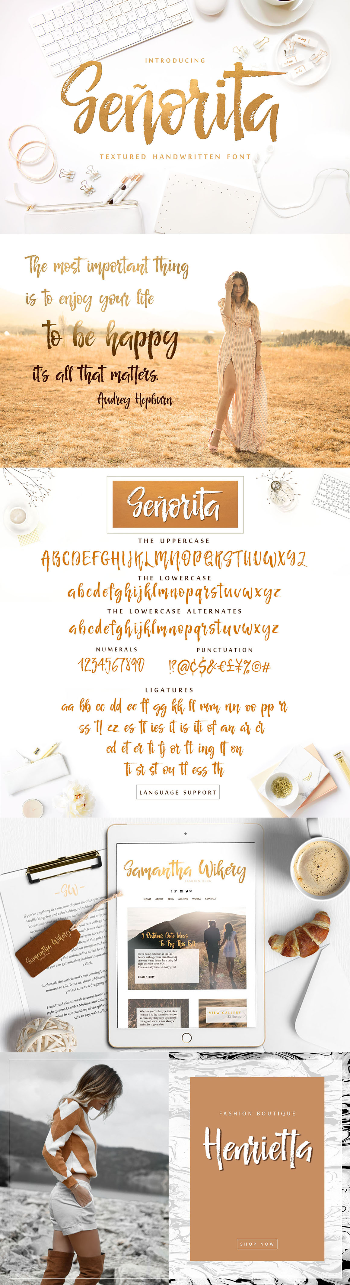 Introducing the hand drawn script Señorita. This font was hand written with dry brush and will look great on branding design, posters, apparel, for logotype, website header, fashion design, wedding card design and any more.