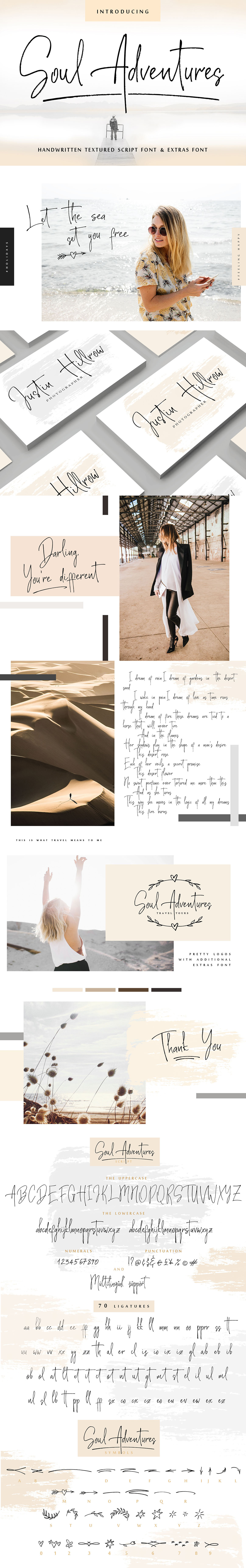 Its hand look style makes it perfect for use in all your design projects be it logos, signatures, labels, packaging design, blog headlines. Also, it will look great in mugs, cards, gorgeous typographic designs, wedding stationery and much more. And additional font Soul Adventures_symbols can help you to make a lot of pretty designs and logos.