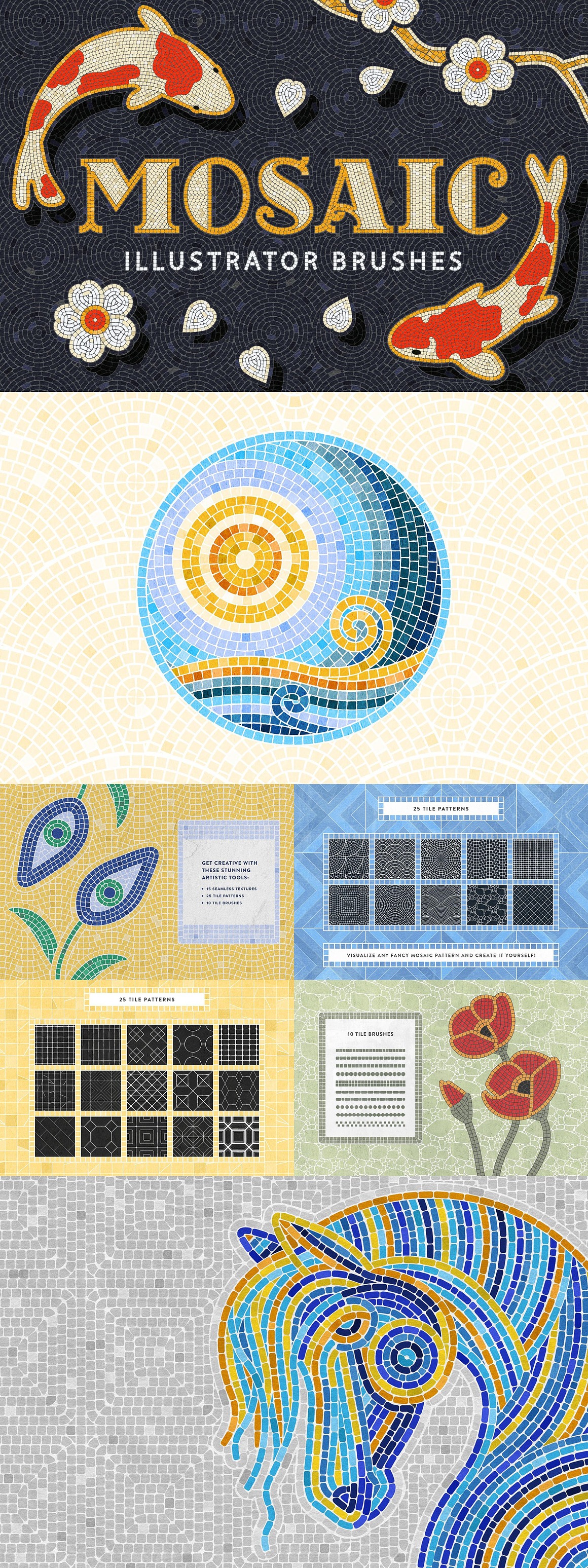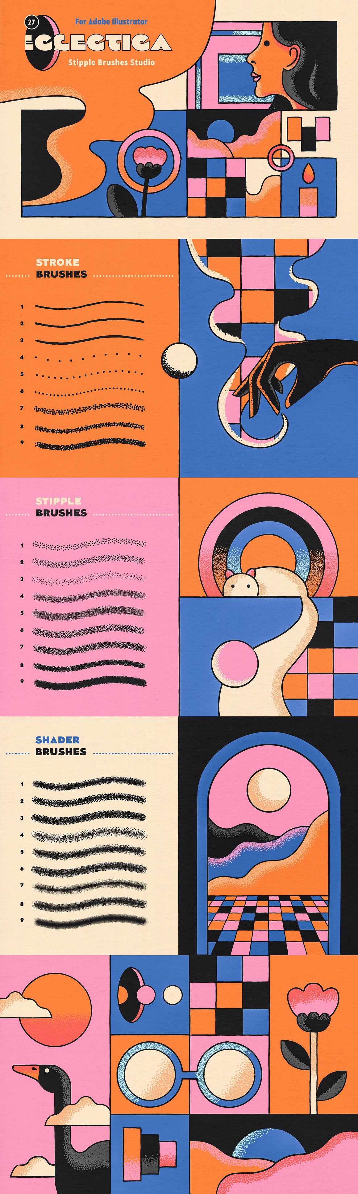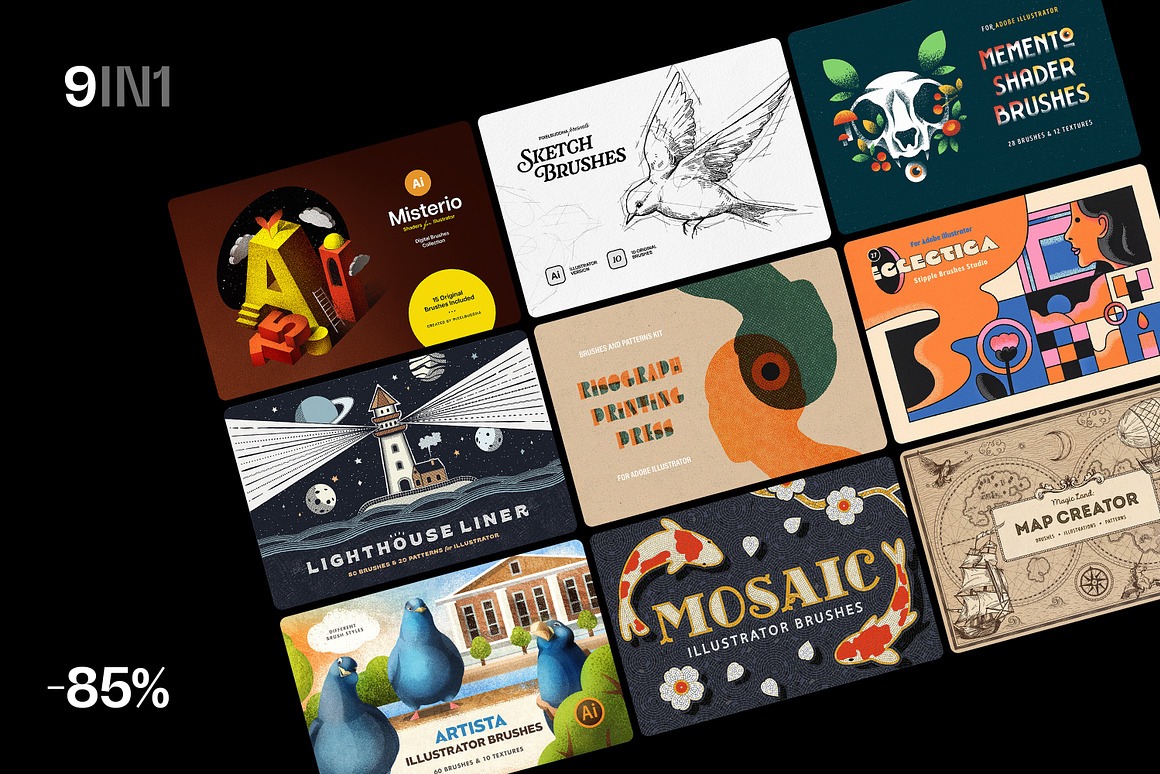 It’s impossible not to be captivated by the myriad of stunning techniques available for self-expression in graphics! While creating, you always succeed in trying brushes for a wide range of styles, from pop art inspo to mosaic patterns. What if textures and patterns happen to be mixed to attain the most outstanding result on your artboard? For that reason, we have curated an exceptional bundle of 9 Illustrator sets with over 350+ brushes.