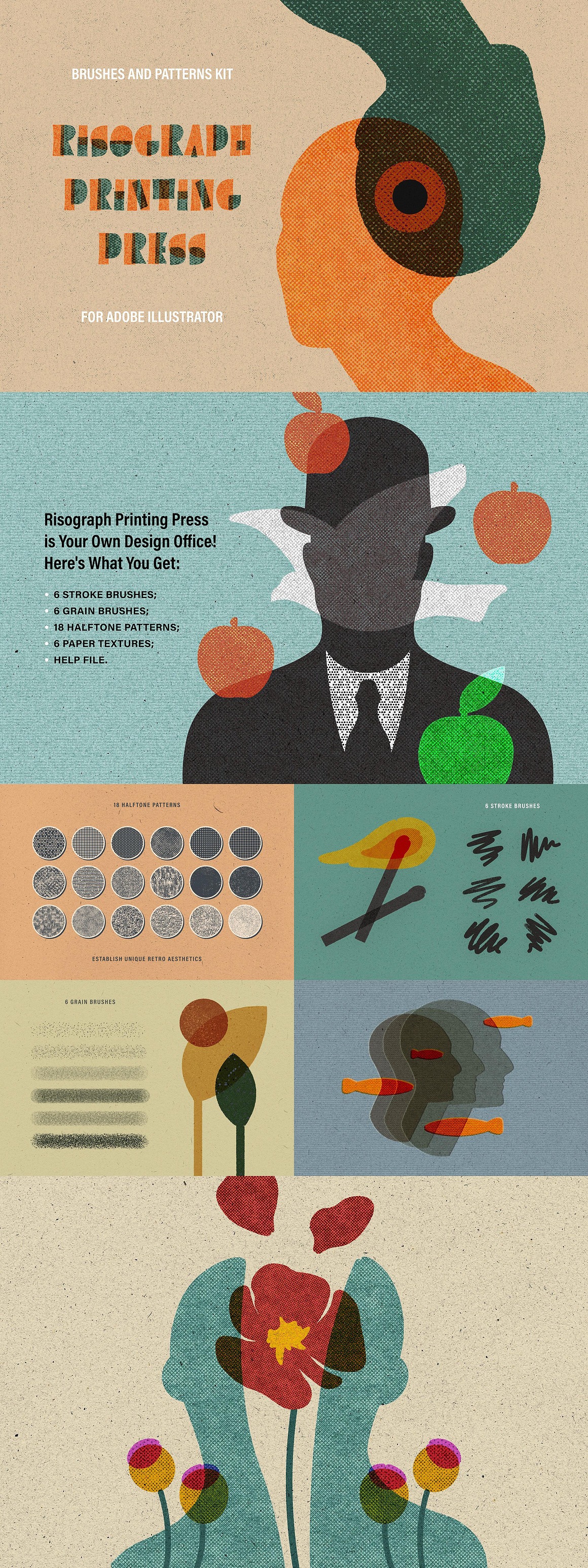If you have been looking for halftone brushes, stop for a second: we made a high-quality pack containing 6 stroke and 6 grain brushes. The set is combined with 18 halftone patterns and 6 paper textures for the best retro-inspired look ever. What a great chance to try all the vintage stylistic features at once, so don’t carry it over to the next ’60s decade!