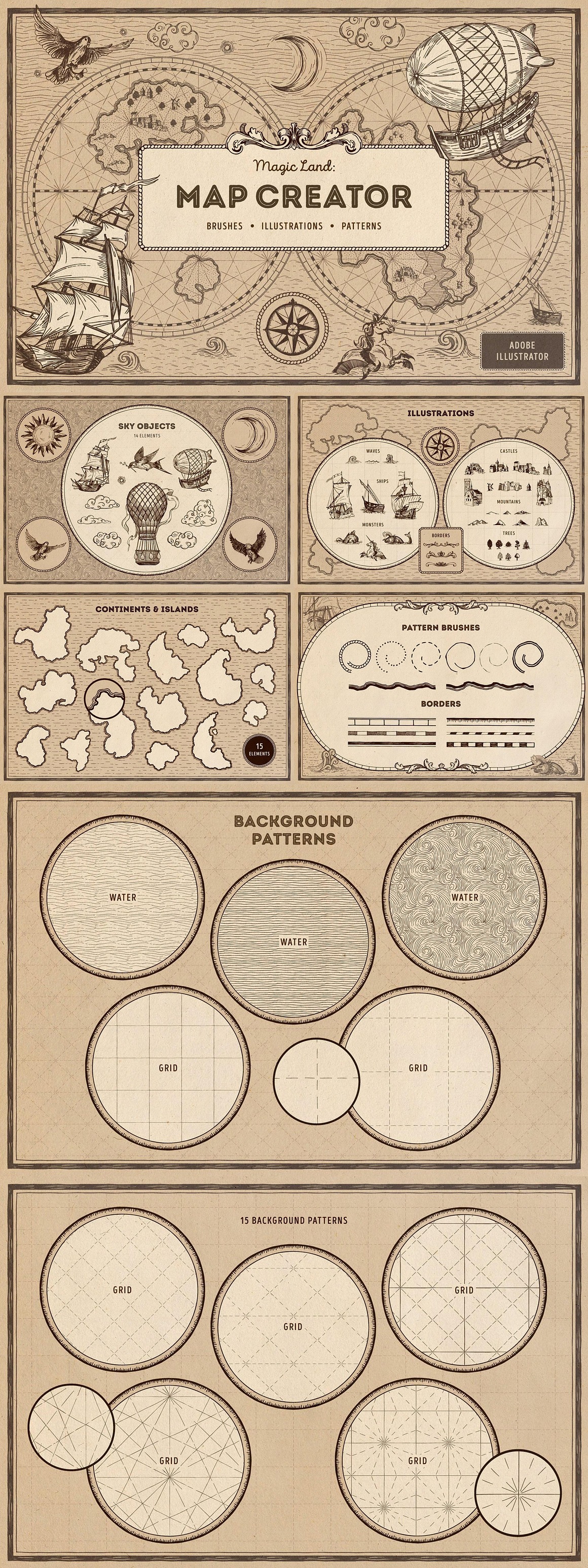 Are you well prepared for the next adventure? Arm yourself with the Vintage Map Creator to feel comfortable during a trip to a magical dimension. Your artboard is a fantasy map now, so on the atlas grid you will meet an abundance of 65 illustration symbols, 15 brushes, and 15 patterns, imitating nature, animals, and voyage tools.