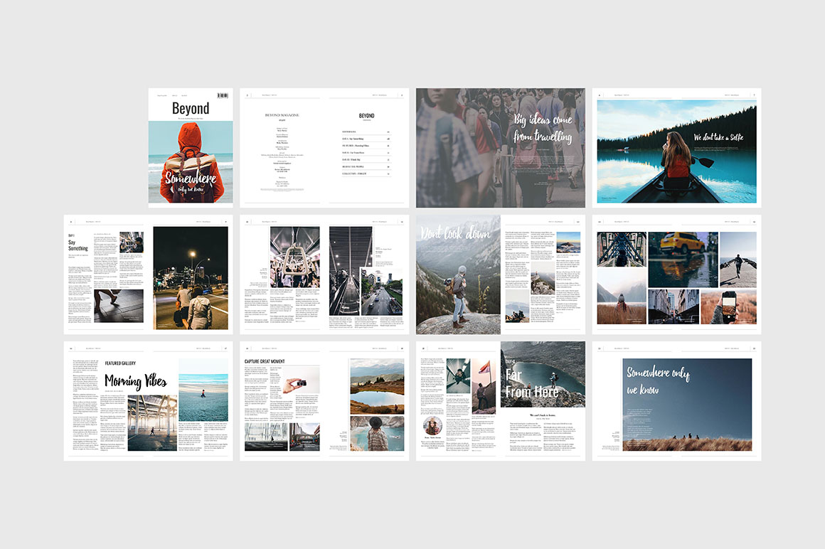 The Beyond Magazine is amazing traveling, instagramer & photography magazine with 38 pages with variation layout for mix and match page. This Is for publication magazine, portfolio, photography, and more. With both size A4 & US Letter size. All layout clean and minimalist design with 12 grid standard A4 & US Letter size. Easy to change all text with paragraph style and default color swatch, you can change with your brand color. Print ready or export as a pdf. Simply replace the logo and brand colors with color pallete.