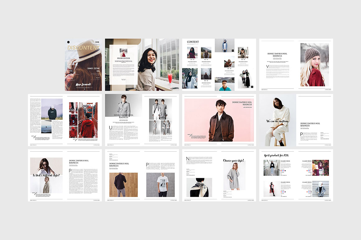 Discontent Magazine is amazing fashion, lifestyle, photography and instagrammers magazine with 40 pages with 6 alternate cover and variation layout for mix and match page. This Is for publication magazine, portfolio, photography, and more. With both size A4 & US Letter size. There are unique spread for your publication and easy to change with your own color pallete, work with master page to make automatic numbering, easy to change all text with paragraph style. Print ready or export as a pdf. Simply replace the logo and brand colors with color pallete.