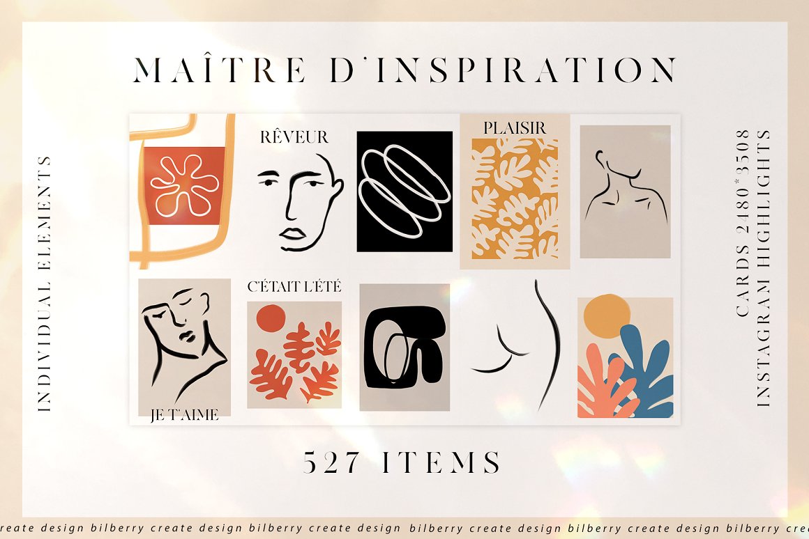 Maître de l’inspiration art set NEW design set filled over 527 elements, cards 2480*3508, instagram highlights, and more… Be sure to click on the image to see all elements. Maître de l’inspiration ❤️ a stylish set in modern abstract art style looks great on fabric, textile, wrapping paper, room design, branding, product packaging. Be sure to click on the image to see all elements. This product was created to help you make your digital images even more beautiful and unique. This pack can be used to create anything as you wish, logos invitation cards, make scrapbooking, wedding cards, birthday cards, home decor, packaging holiday gifts, party decorations, print on fabrics and so much more.