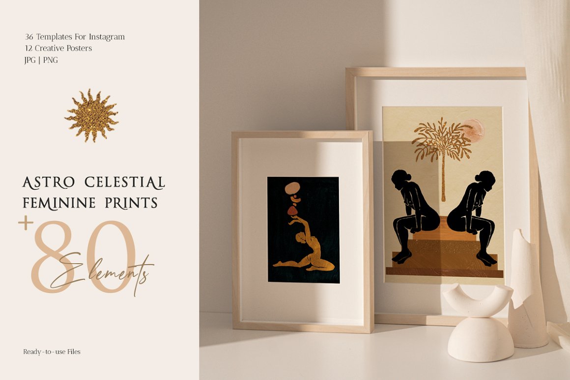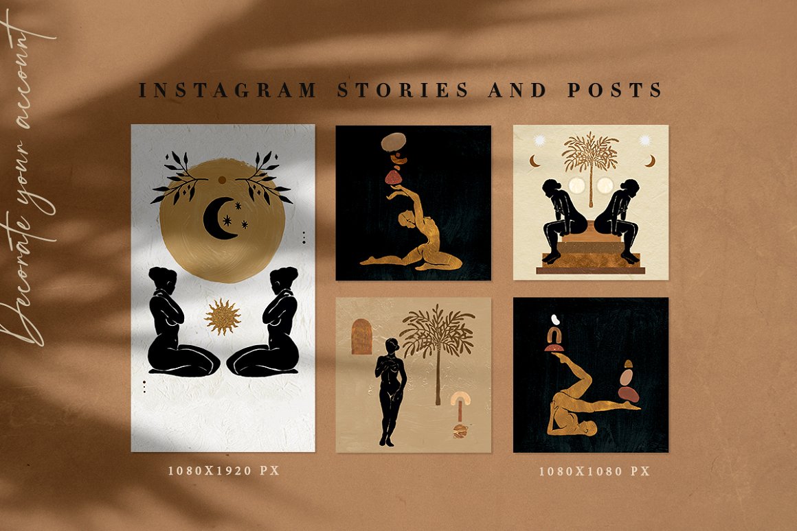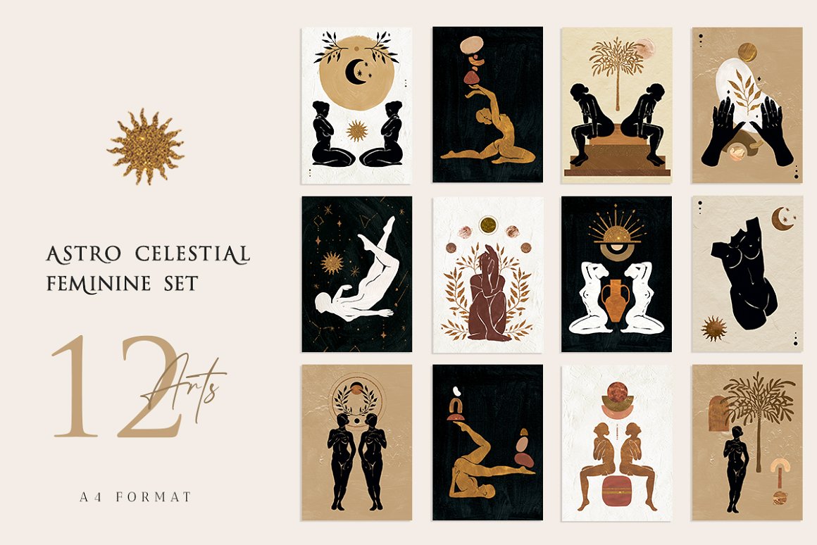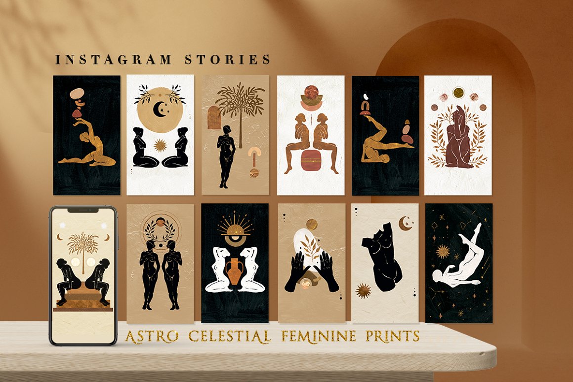 ☾○ Astro Celestial Feminine Set – delicate collection made with patience and love! You can create your own compositions using modern abstract shapes, handmade textures and silhouettes of a female figures! Also you can use pre-made Printable A4 Postcards for decorating your workplace or living room wall. Add unique touch to your instagram account!