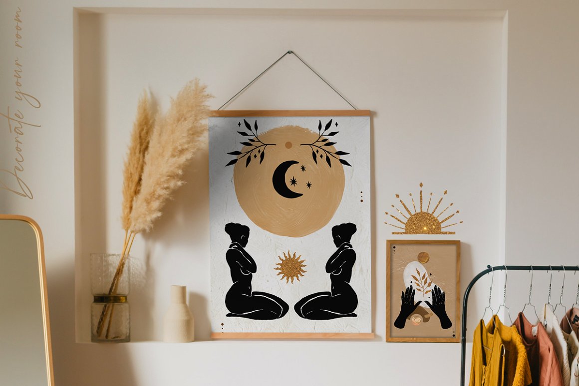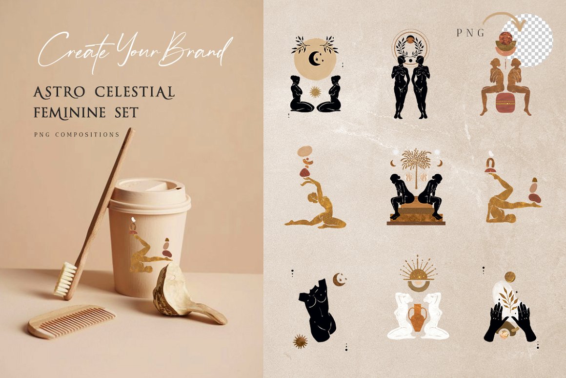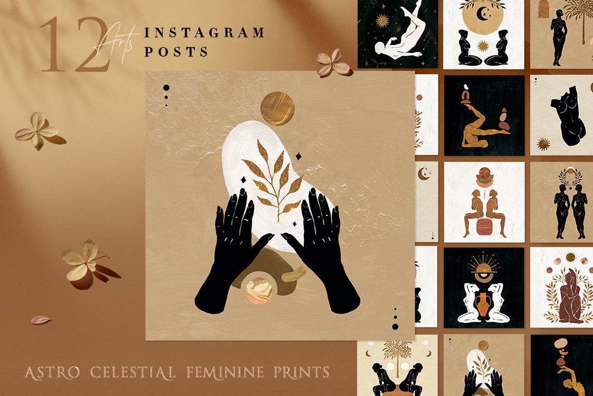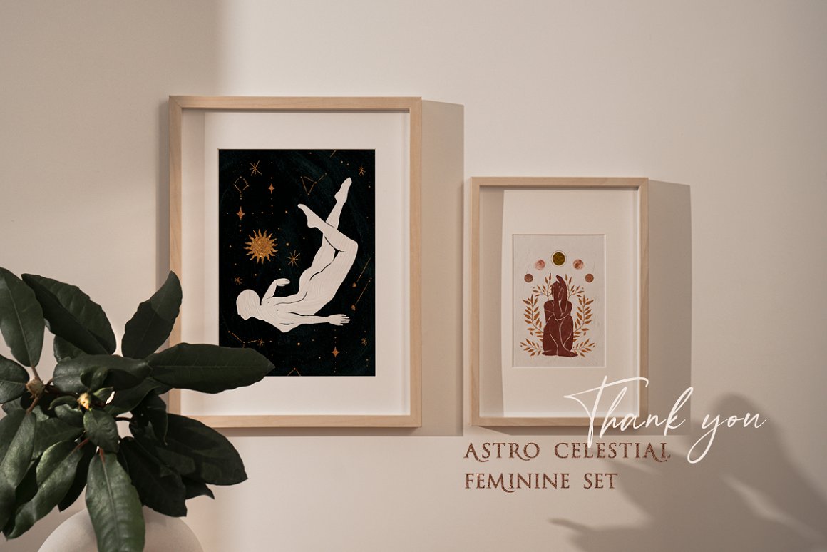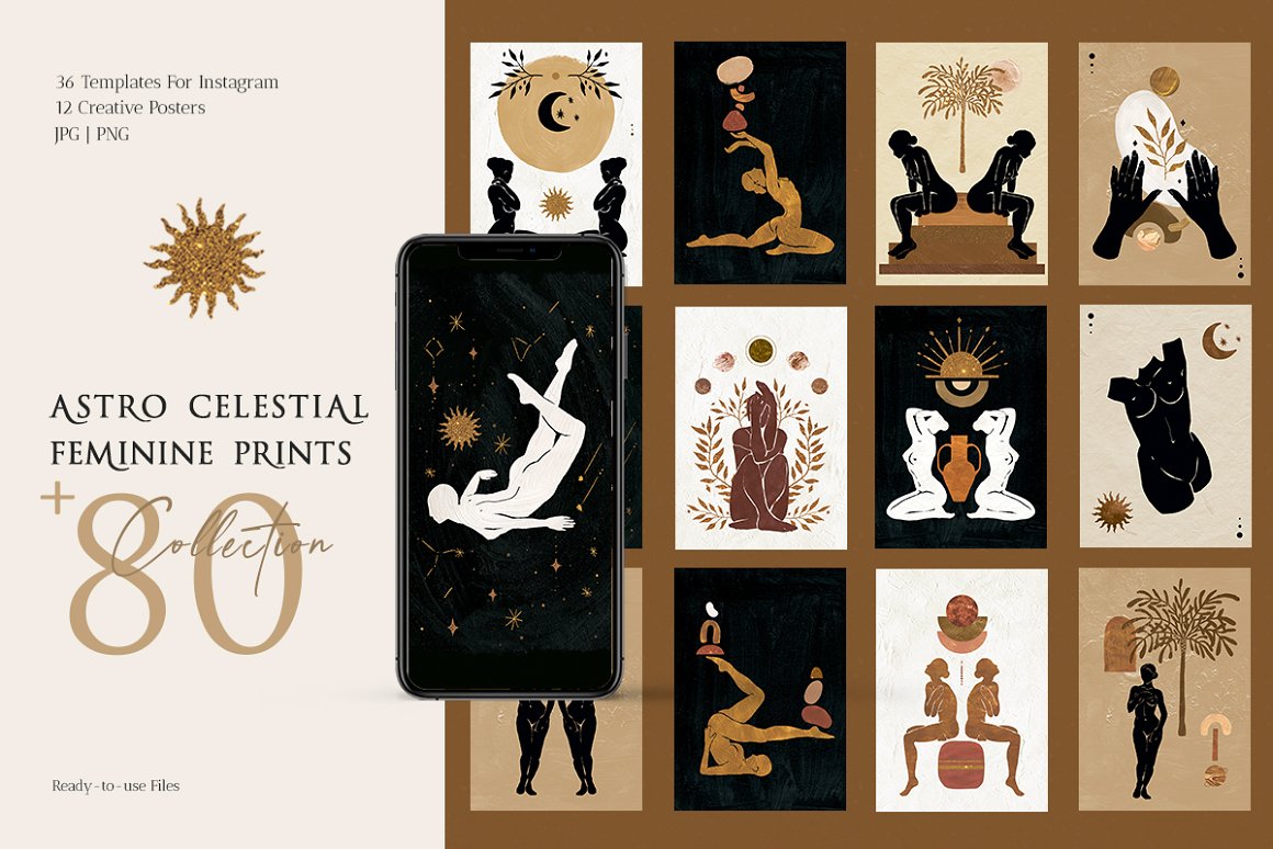 ☾○ Astro Celestial Feminine Set – delicate collection made with patience and love! You can create your own compositions using modern abstract shapes, handmade textures and silhouettes of a female figures! Also you can use pre-made Printable A4 Postcards for decorating your workplace or living room wall. Add unique touch to your instagram account!