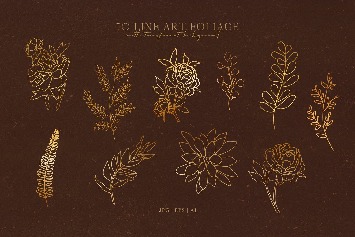 - 10 Line art foliage ( AI | PNG | EPS : 5000×5000 px, 300 dpi) in black and gold colors