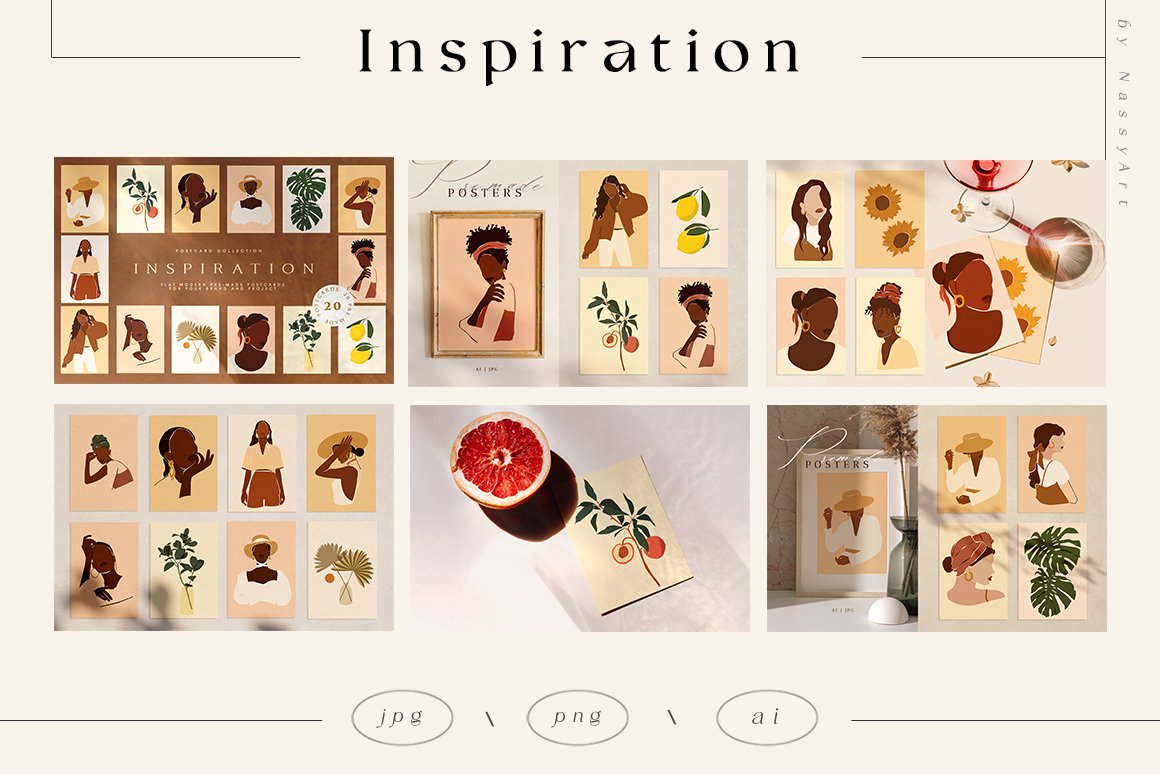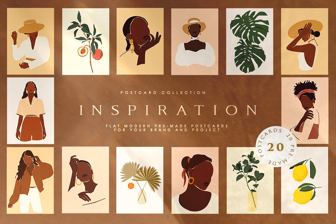 Inspiration Postcard Collection – Decorate your wall with this collection of modern&fashion postcards, use them for posts in Instagram and your projects. Use these elements to create your own unique Instagram account design or branding. You just need to select card and crop it, combine other provided items or add a quote on the empty space. And the personal card will be ready! In this pack, you can find a variety of fashionable arts and abstract modern illustrations. They are available to mix and match for design projects with endless composition combinations of all pieces. These elements are ideal for the creation of printed products: notebooks, invitations, personal postcards, branding identity and Instagram posts. Add these beautiful vector graphics to create your own interesting profile, branding style, send cards to your best friends, present for someone important or decorate your working place with the wall posters.